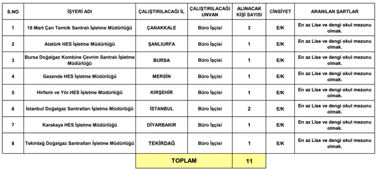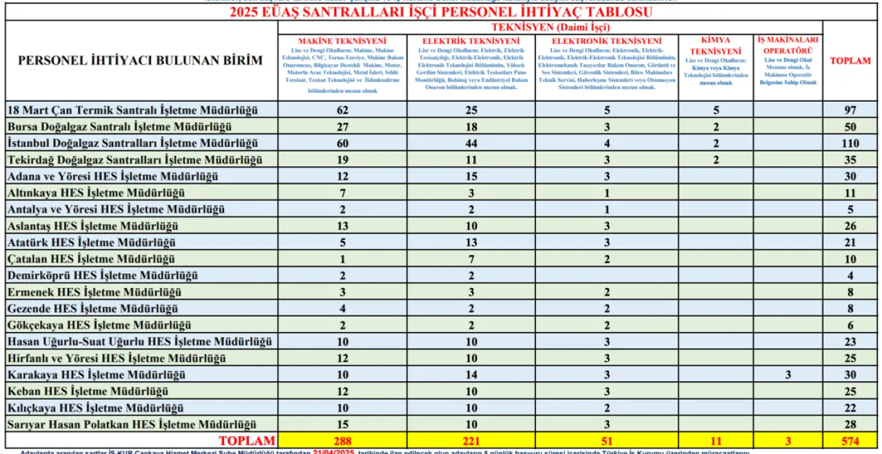 14 Nisan 2025 tarihli yayımlanmış olan duyuru kapsamında EÜAŞ bünyesine Engelli, Eski Hükümlü ve Sürekli işçi statüsünde 601 işçi personel alımı yapılacak. Buna göre;