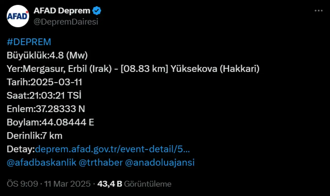 AFAD, Irak’ın kuzeyindeki Erbil kentinde 4.8 büyüklüğünde deprem meydana geldiğini açıkladı. Merkez üssü Mergasur bölgesi olan deprem Hakkari’den de hissedildi. AFAD'ın paylaştığı bilgilere göre Hakkari'nin Yüksekova ilçesine 4,8 büyüklüğünde deprem meydana geldi.