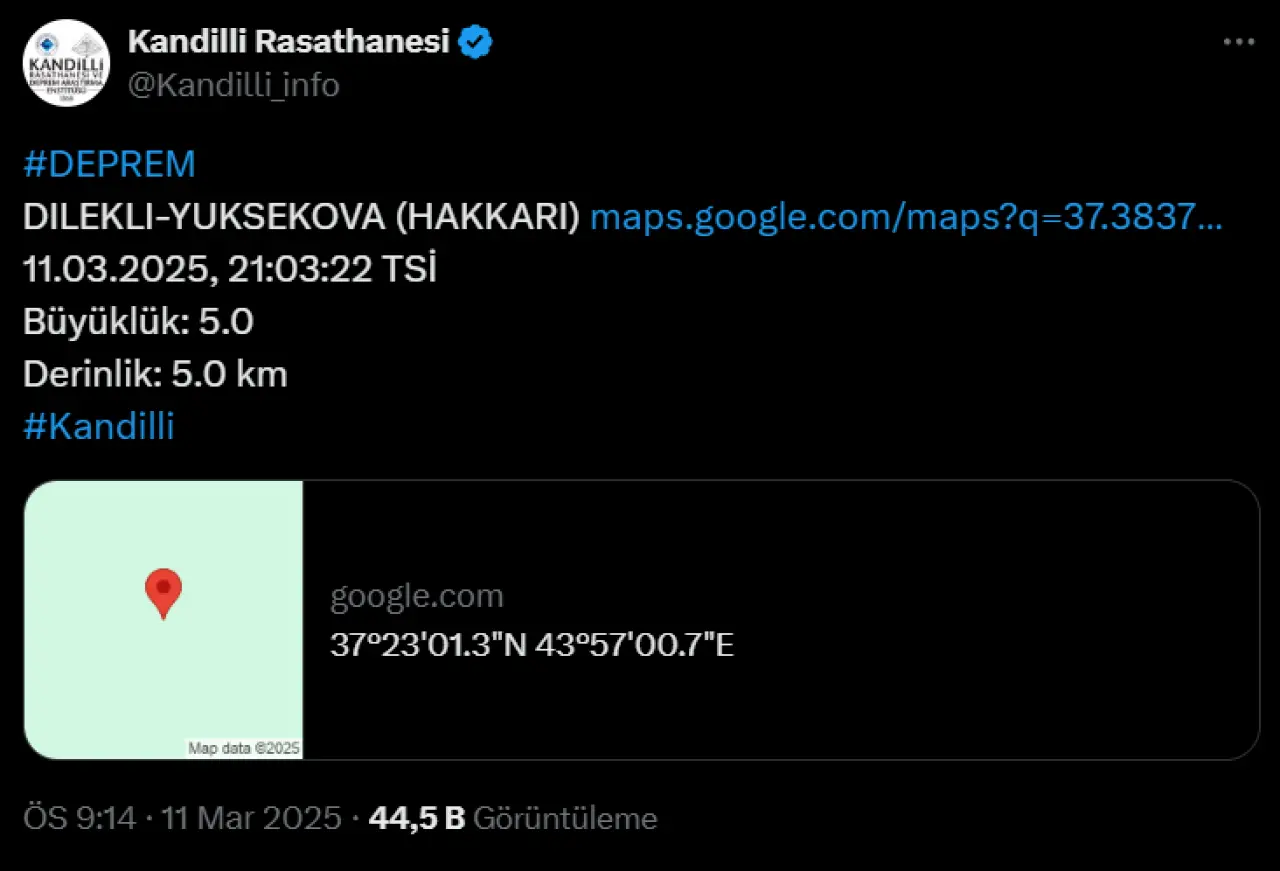 Kandilli Rasathanesi'nin paylaştığı bilgilere göre, Hakkari Yüksekova'da 5 büyüklüğünde deprem meydana geldiğini duyurdu.