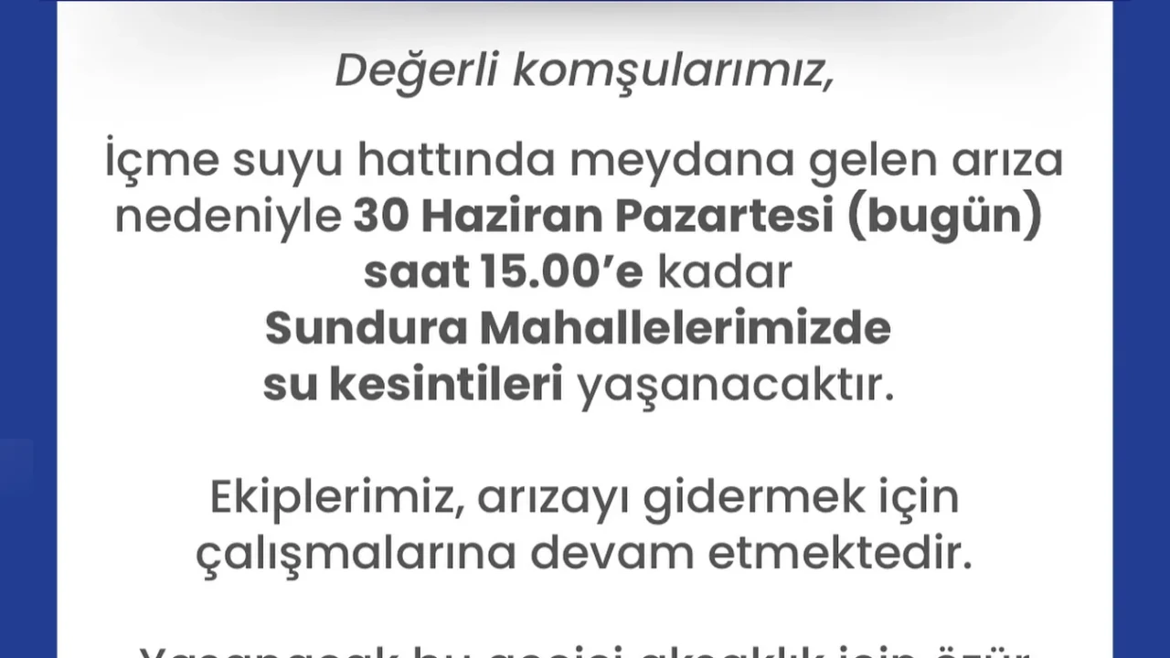 Belediye yetkilileri, yaşanan aksaklıktan dolayı özür dileyerek, “Vatandaşlarımızın günlük yaşamını en az şekilde etkileyecek çözümleri hızlıca uygulamaya koyduk. Çalışmalarımız tamamlandığında su yeniden verilecektir” açıklamasında bulundu.