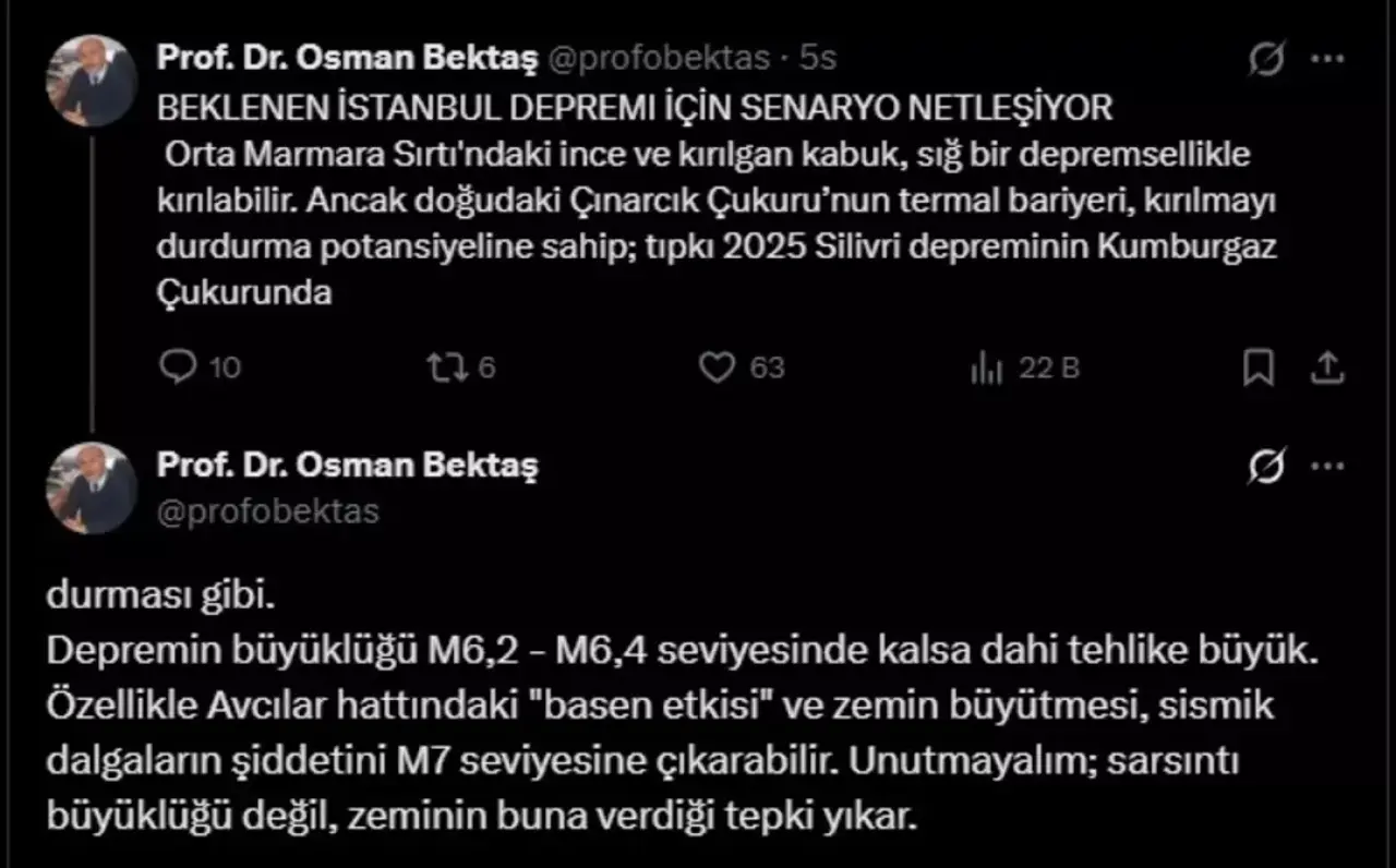 Beklenen büyük İstanbul depremiyle ilgili bilim dünyasından kritik bir değerlendirme daha geldi. Jeofizik Mühendisi Prof. Dr. Osman Bektaş, deprem