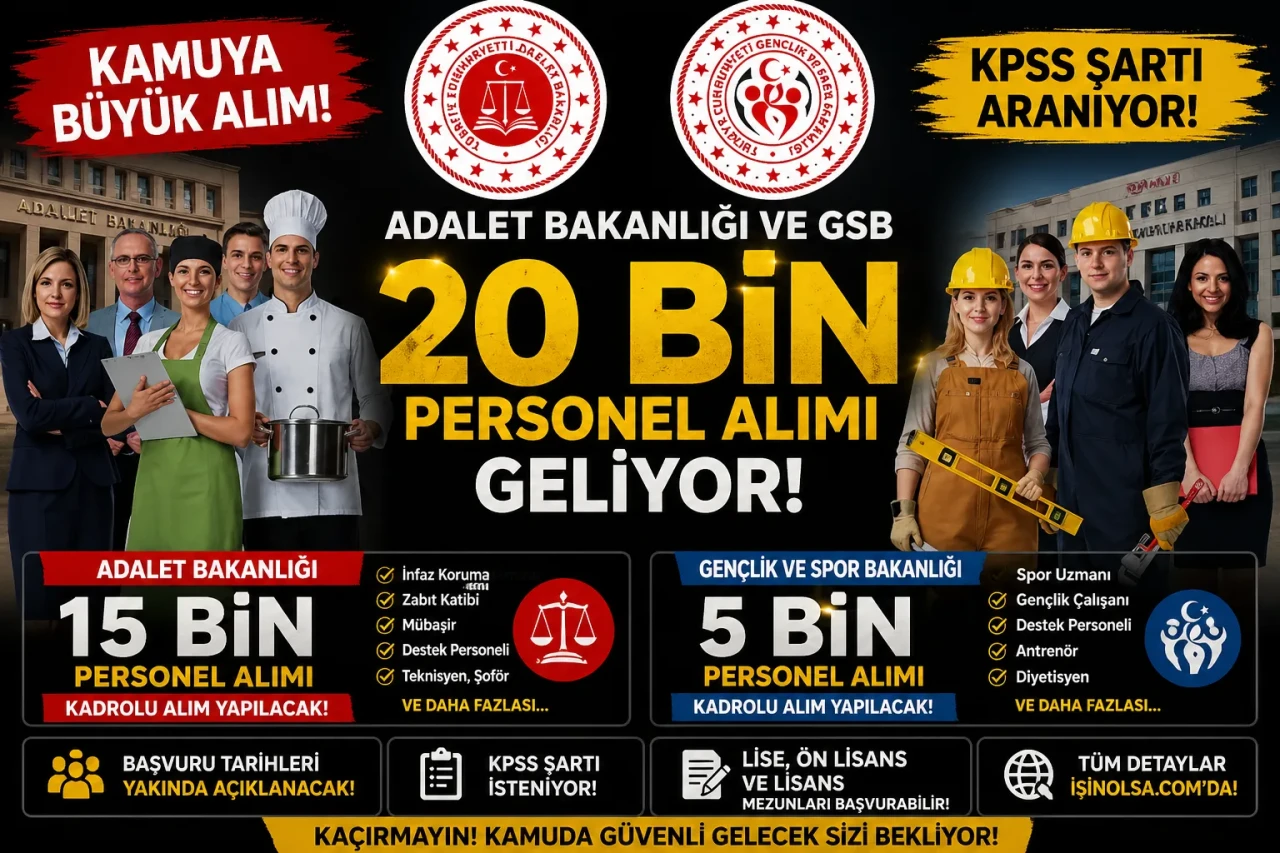 2026 yılının en kapsamlı kamu istihdamı hamlesi yaklaşıyor. Adalet Bakanlığı’nın 15 bin, Gençlik ve Spor Bakanlığı’nın ise 5 bin kişilik personel alımıyla toplamda 20 bin kadronun önümüzdeki haftalarda adaylara açılması bekleniyor. Her iki bakanlıktan da resmi ilanlar henüz yayımlanmadı; ancak yapılan açıklamalar sürecin Mayıs 2026’da netleşeceğine işaret ediyor.