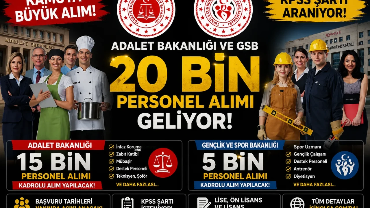 Adalet Bakanlığı 15 bin, Gençlik ve Spor Bakanlığı ise 5 bin yeni personel almak üzere 2026 yılı için istihdam planlaması yaptı. Kamuya yapılacak bu alımlara dair kadro detayları, KPSS şartları ve başvuru tarihleri hakkında bilgi verildi. Başvuruların nasıl yapılacağı merak ediliyor.