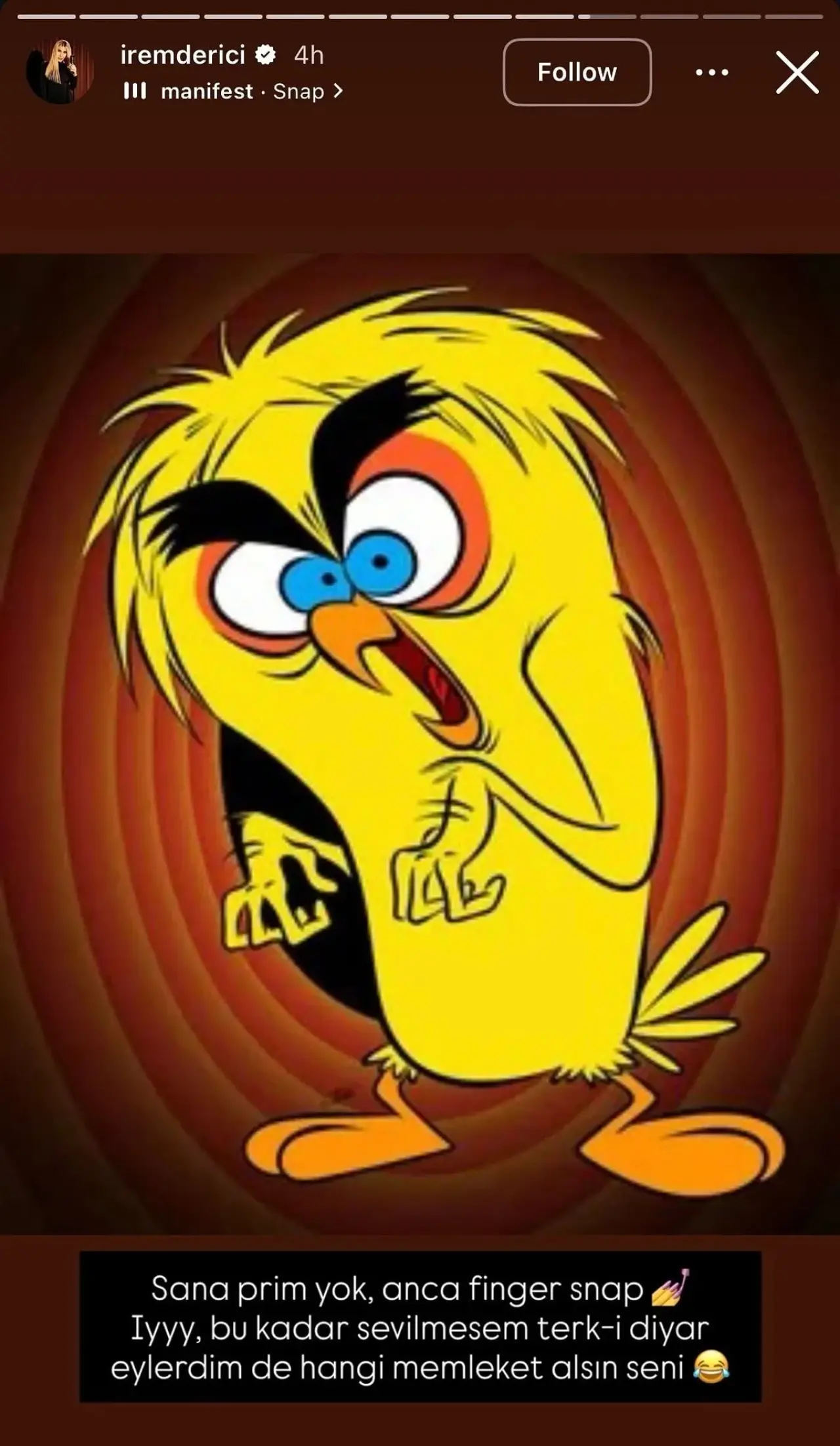 “Sana prim yok, anca finger snap! Sorry, bu kadar sevilemsem terk-i diyar eylerdim de hangi memleket alsın seni!”