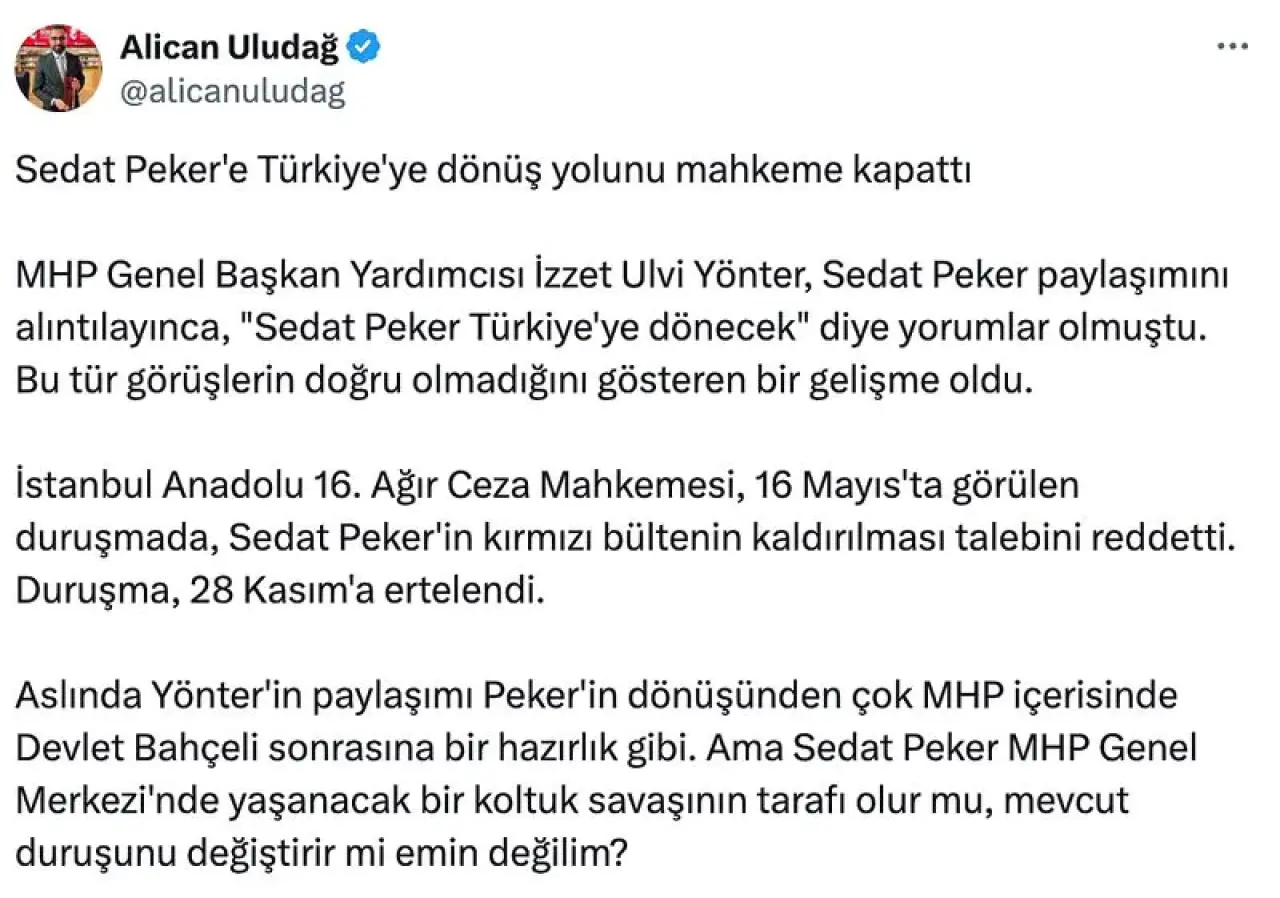 Gazeteci Alican Uludağ’ın aktardığına göre, mahkeme 16 Mayıs’ta görülen duruşmada Sedat Peker’in talebini kabul etmedi ve davanın bir sonraki duruşmasını 28 Kasım 2025 tarihine erteledi.