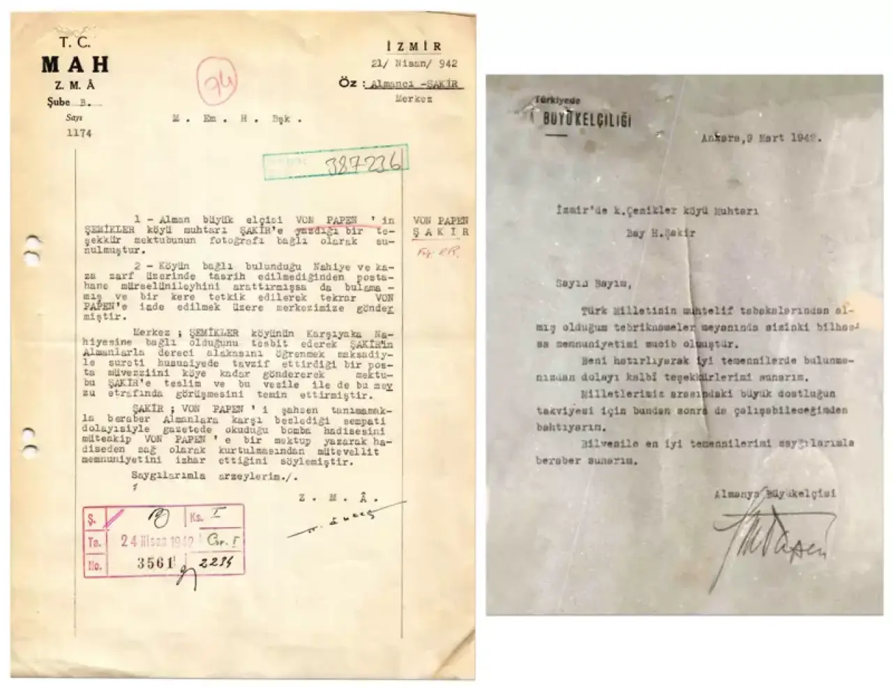 Bilvesile en iyi temennilerimi saygılarımla beraber sunarım." ifadeleri yer aldı.İzmir Merkez Amirliğinin konuya ilişkin 21 Nisan 1942 tarihli yazısında ise şunlar kaydedildi:"Alman büyük elçisi Von Papen'in, Şemikler köyü muhtarı Şakir'e yazdığı bir teşekkür mektubunun fotoğrafı bağlı olarak sunulmuştur.
