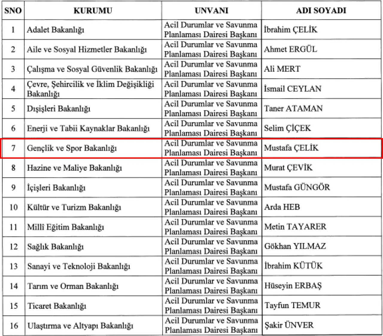 Gençlik ve Spor Bakanlığı’nda üst düzey atama gerçekleştirildi. Cumhurbaşkanı Recep Tayyip Erdoğan’ın imzasıyla yayımlanan ve 16 bakanlığı kapsayan atama kararları Resmi Gazete’de yayımlandı. Karar kapsamında Ankara Gençlik ve Spor İl Müdürü Mustafa Çelik, Gençlik ve Spor Bakanlığı Acil Durumlar ve Savunma Planlaması Başkanlığı görevine getirildi.