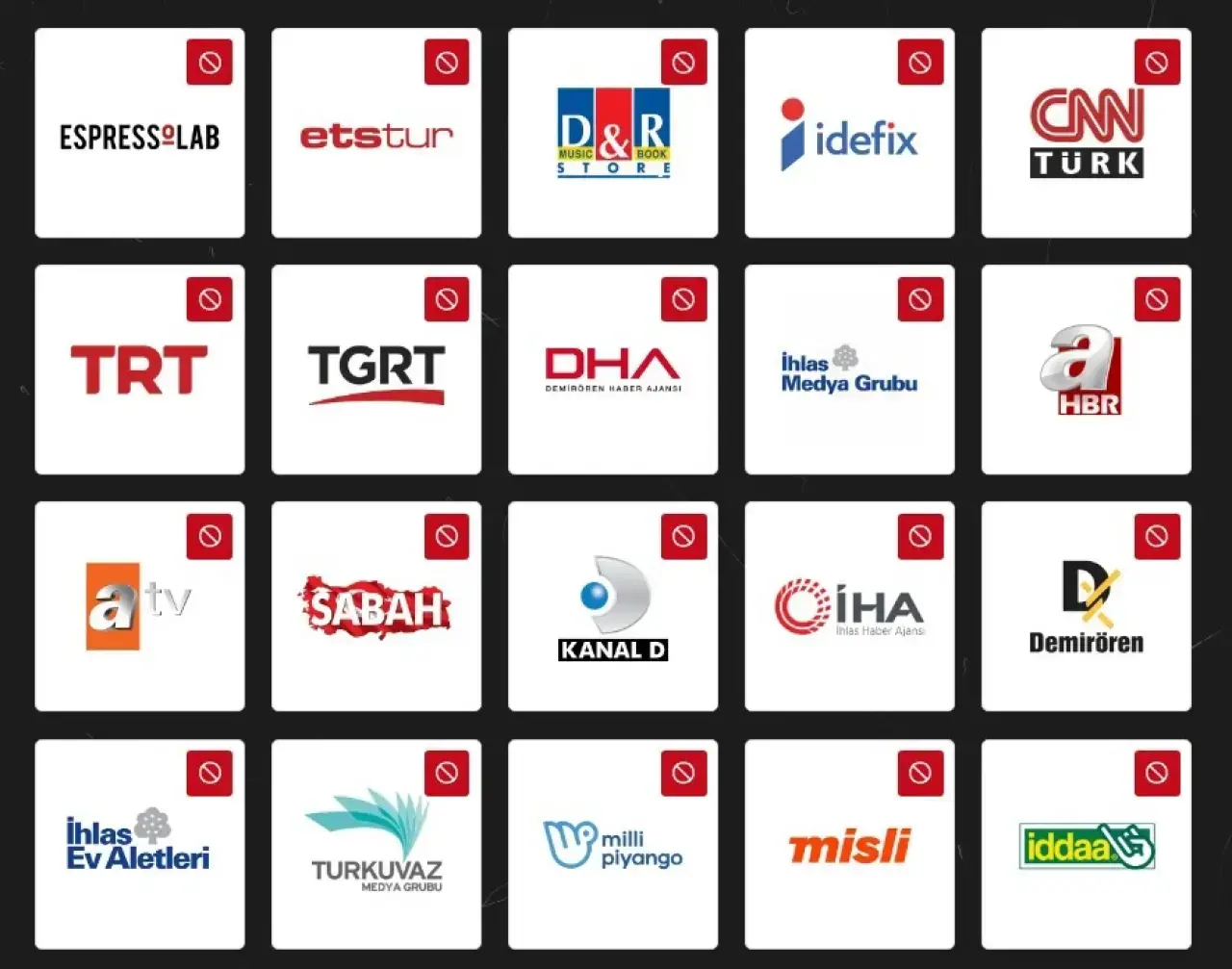 Ekrem İmamoğlu'nun tutukluluğunu protesto etmek için CHP'nin paylaştığı boykot listesinde Espressolab, etstur, D&R, idefix, CNN Türk, TRT, TGRT, Demirören Haber Ajansı (DHA), İhlas Medya Grubu, a Haber, ATV, Sabah, Kanal D, İhlas Haber Ajansı (İHA), Demirören Holding, İhlas Ev Aletleri, Turkuvaz Medya Grubu, Milli Piyango, misli.com ve iddaa yer alıyor.