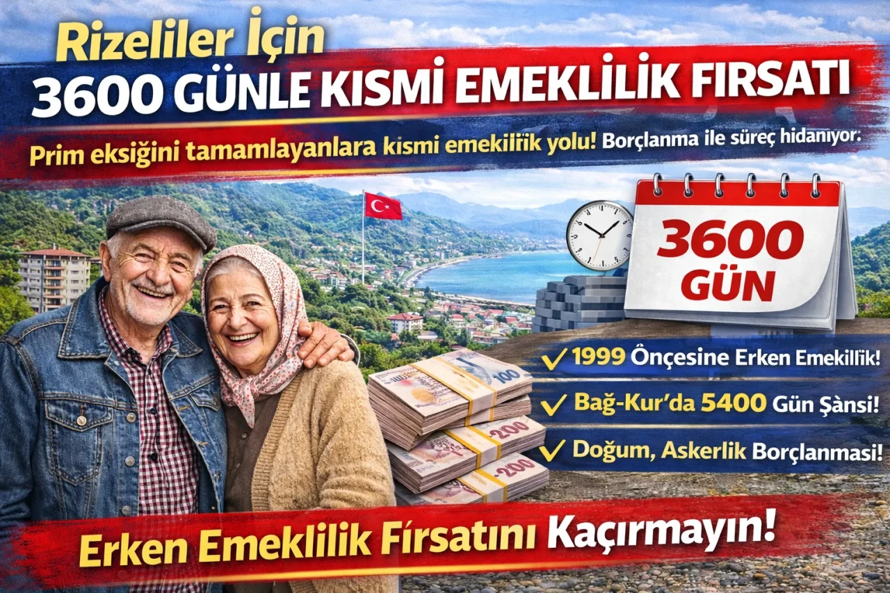 Rize’de uzun yıllar çalışan ancak prim gün sayısını tamamlayamayan sigortalılar için 3600 günle emeklilik modeli yeniden gündeme geldi. Sosyal Güvenlik Kurumu (SGK) tarafından uygulanan kısmi emeklilik sistemi, prim eksiği bulunan çalışanlara alternatif bir çözüm sunuyor. Özellikle 1999–2012 yılları arasında sigorta girişi olanlar için bu seçenek önemli bir fırsat olarak öne çıkıyor.