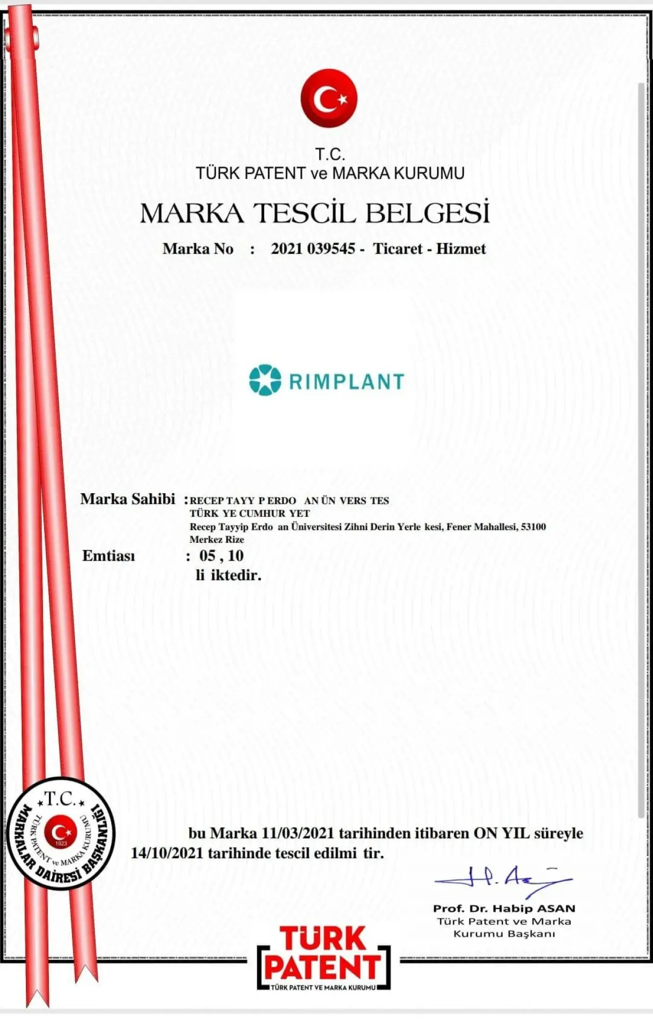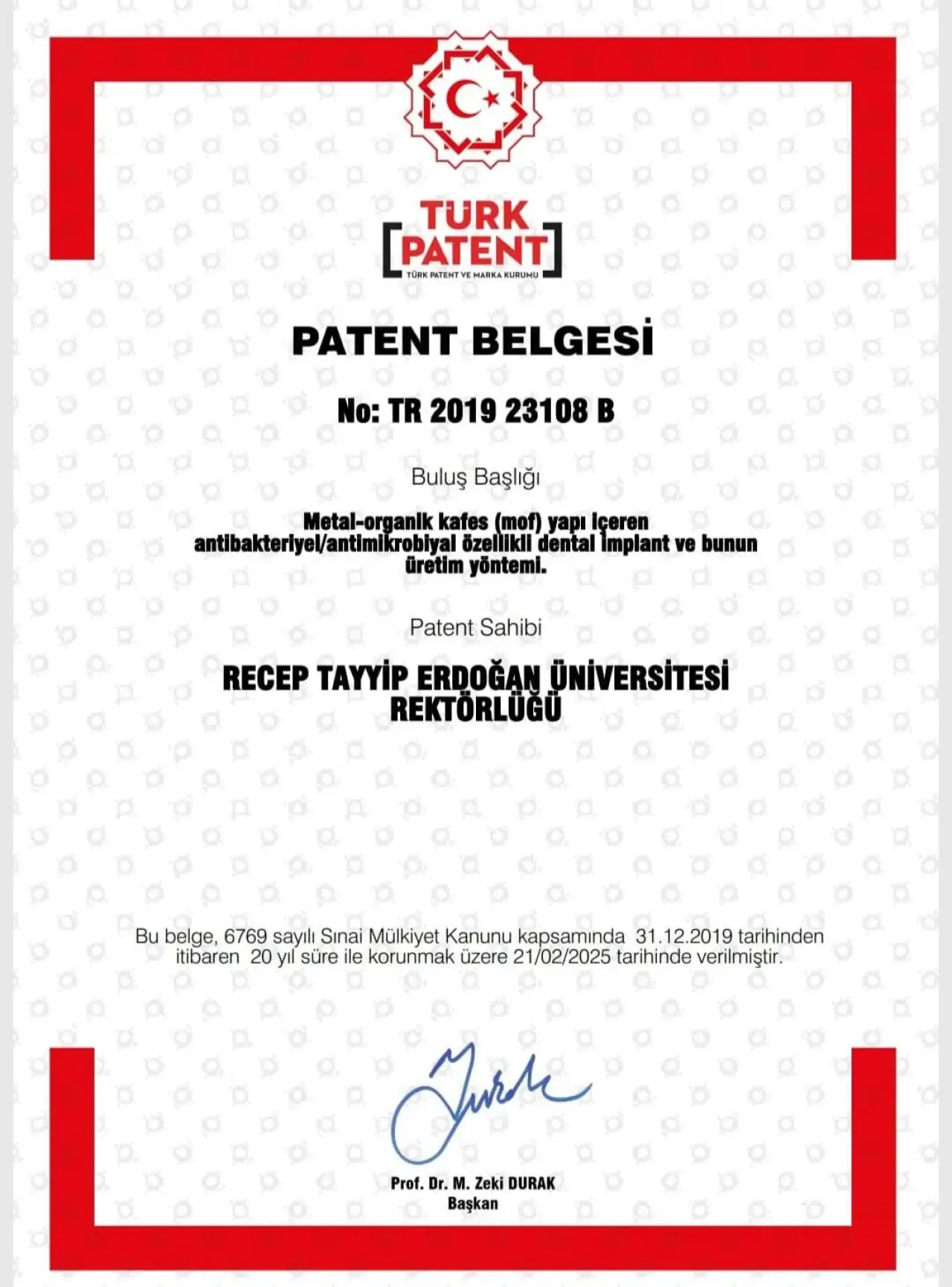 RTEÜ Akademisyenleri tarafından geliştirilen “Metal-Organik Kafes (Mof) Yapı İçeren Antibakteriyel/Antimikrobiyal Özellikli Dental İmplant ve Bunun Üretim Yöntemi” başlıklı patent başvurusu Türk Patent ve Marka Kurumundan patent tescili aldı.