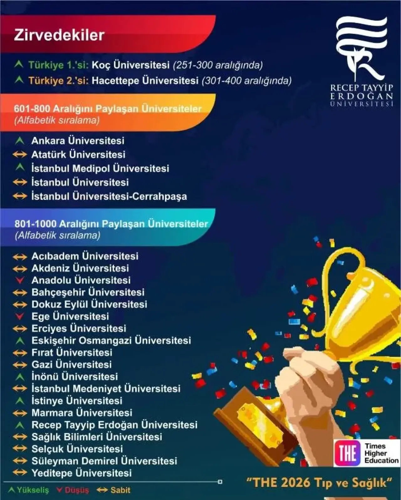 Recep Tayyip Erdoğan Üniversitesi (RTEÜ), uluslararası arenadaki yükselişini sürdürüyor. Dünyanın en saygın yükseköğretim derecelendirme kuruluşlarından Times Higher Education (THE) tarafından yayınlanan “2026 Tıp ve Sağlık Alanı Dünya Üniversiteler Sıralaması”nda RTEÜ, dünyada ilk 1000 üniversite arasına adını yazdırdı.