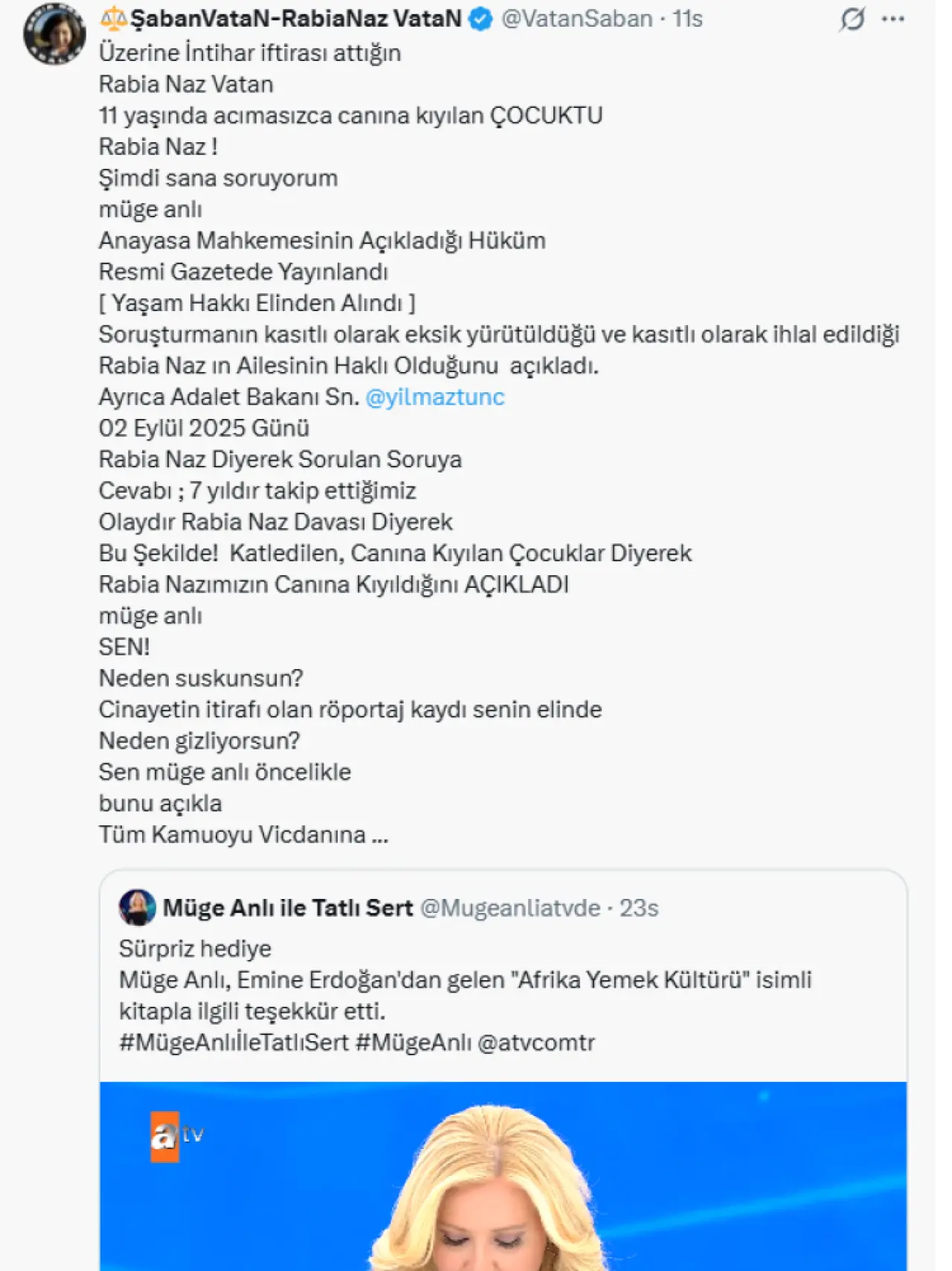 Rabia Naz Vatan’ın babası Şaban Vatan, sosyal medya platformu X’te yaptığı paylaşımda, kızının ölümüyle ilgili yıllardır süren adalet arayışını yeniden gündeme taşıdı. Vatan, Müge Anlı’nın bir paylaşımını alıntılayarak sert eleştiriler yöneltti.