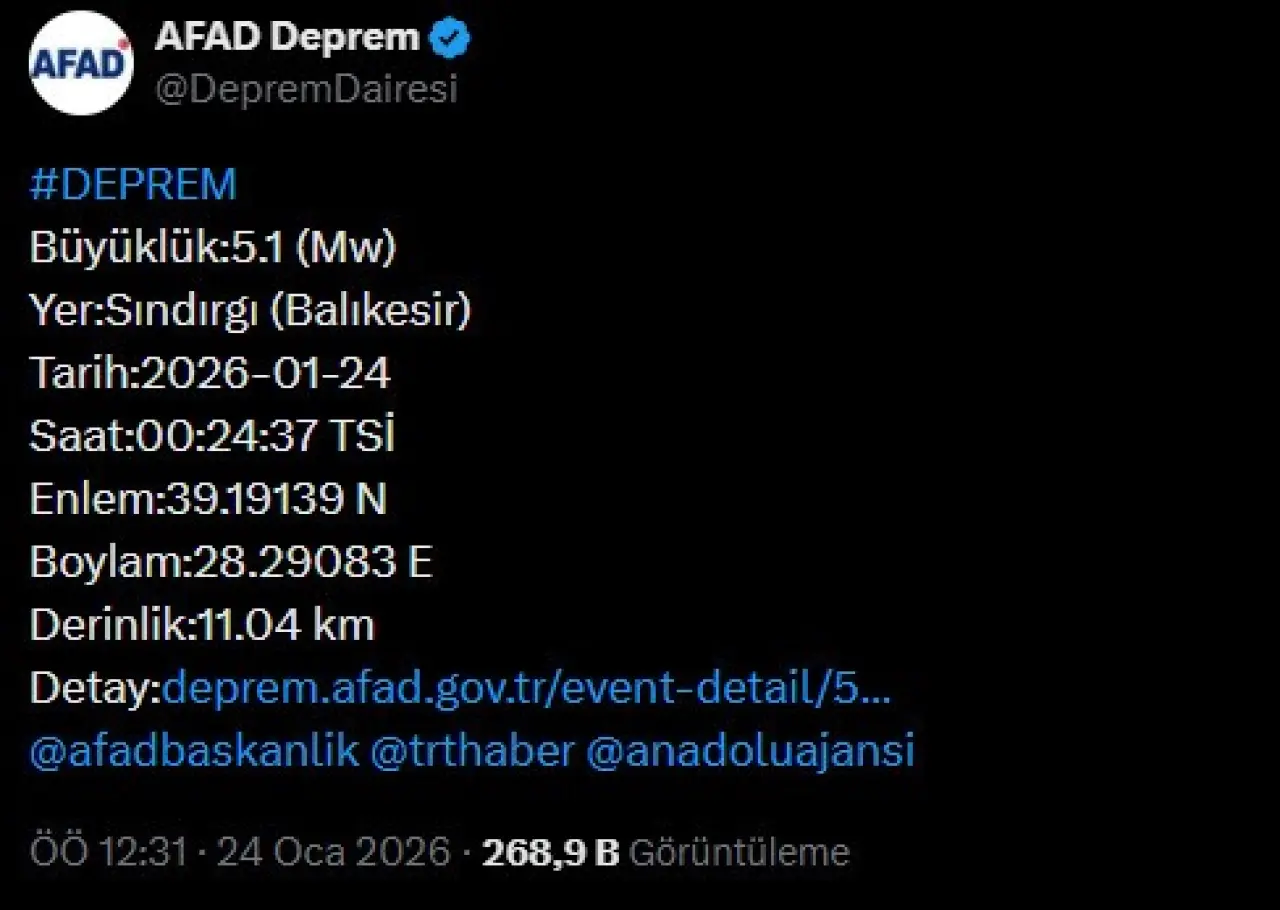 AFAD’ın paylaştığı bilgilere göre, Balıkesir’in Sındırgı ilçesinde saat 00.24’te 5.1 büyüklüğünde deprem meydana geldi. Depremin derinliği ise 11.04 kilometre olarak kaydedildi.