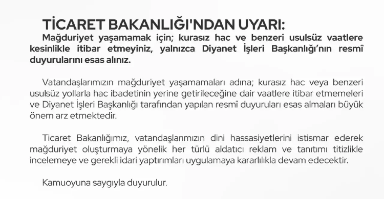 Ticaret Bakanlığı, vatandaşların mağduriyet yaşamaması için “kurasız hac” gibi usulsüz vaatlere itibar etmemeleri ve yalnızca Diyanet İşleri Başkanlığı’nın resmi duyurularını dikkate almaları gerektiği vurgulanırken, Bakanlık, dini hassasiyetleri istismar eden aldatıcı reklam ve tanıtımları titizlikle incelemeye ve gerekli yaptırımları uygulamaya devam edeceğinin altını çizdi.