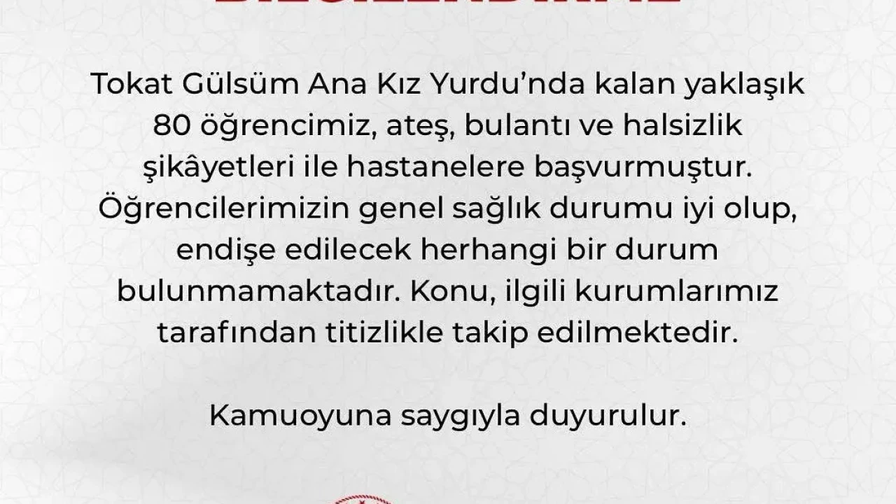 Tokat Valiliği’nden yapılan yazılı açıklamada, “Tokat Gülsüm Ana Kız Yurdu’nda kalan yaklaşık 80 öğrencimiz, ateş, bulantı ve halsizlik şikayetleri ile hastanelere başvurmuştur. Öğrencilerimizin genel sağlık durumu iyi olup, endişe edilecek herhangi bir durum bulunmamaktadır. Konu, ilgili kurumlarımız tarafından titizlikle takip edilmektedir.” ifadelerine yer verildi.
