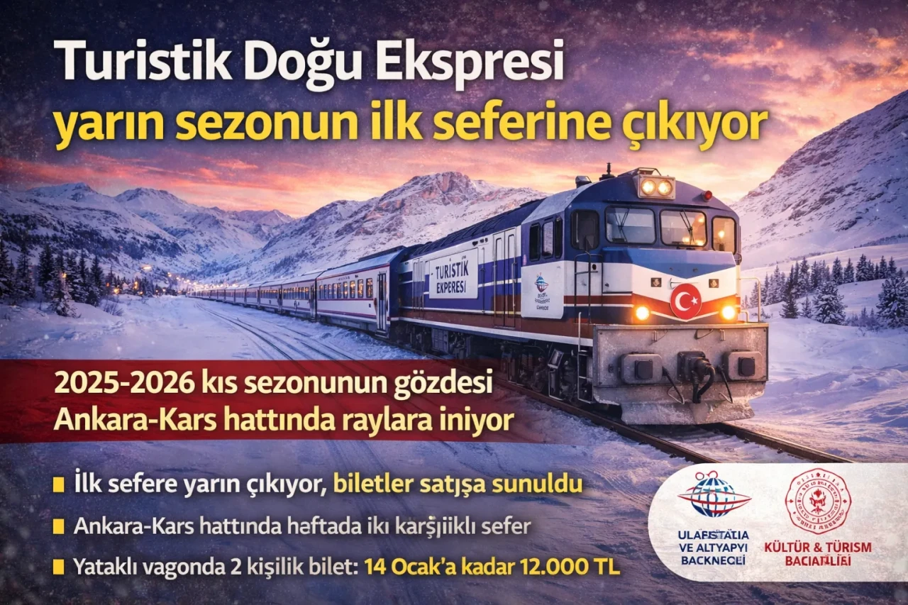 Ulaştırma ve Altyapı Bakanlığı ile Kültür ve Turizm Bakanlığı iş birliğinde hayata geçirilen Turistik Doğu Ekspresi’nin 2025-2026 kış sezonundaki ilk yolculuğu yarın başlıyor. Seferler, belirlenen günlerde karşılıklı olarak düzenlenecek.