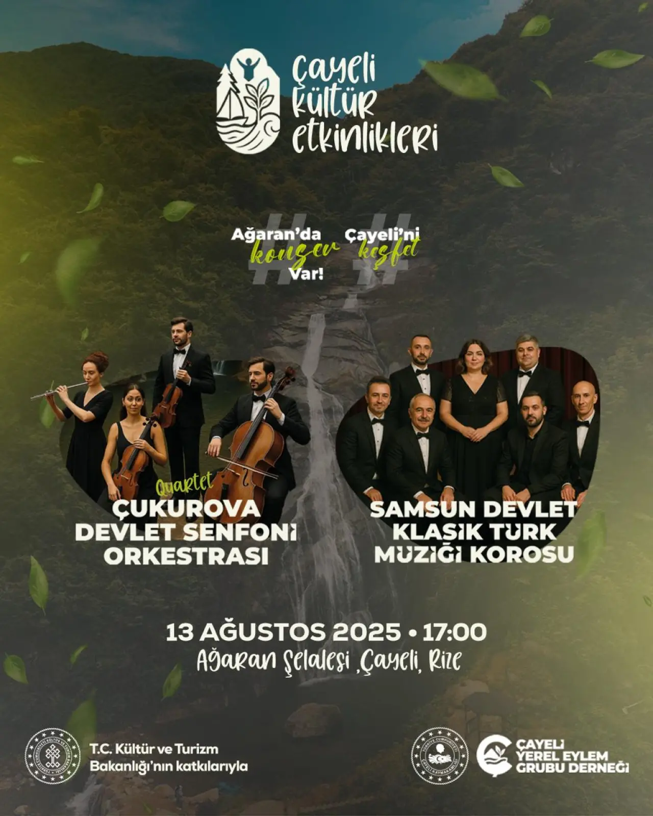 Kültür ve Turizm Bakanlığı’nın katkılarıyla düzenlenen 'Çayeli Kültür Etkinlikleri' kapsamında sahneye önce Çukurova Devlet Senfoni Orkestrası Quartet çıkacak. Ardından, Samsun Devlet Klasik Türk Müziği Korosu, eserlerini Ağaran Şelalesi’nin şırıltısına eşlik eden melodilerle seslendirecek.