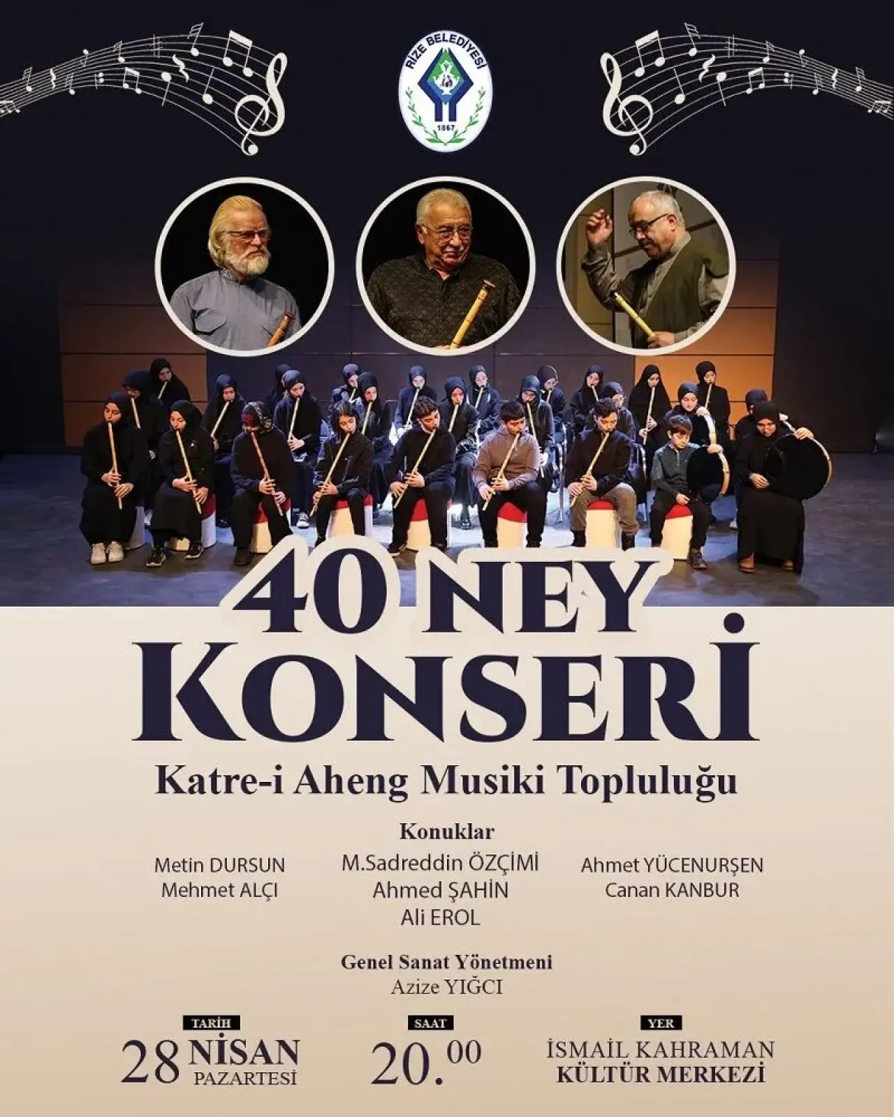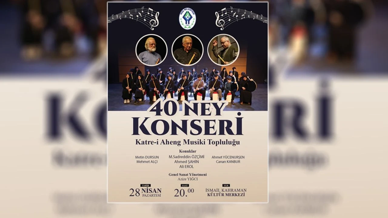 Belediyeden yapılan açıklamada, 28 Nisan Pazartesi günü saat 20.00’de İsmail Kahraman Kültür Merkezi’nde gerçekleşecek olan “40 Ney Konseri”ne tüm halkımız davet edildi.