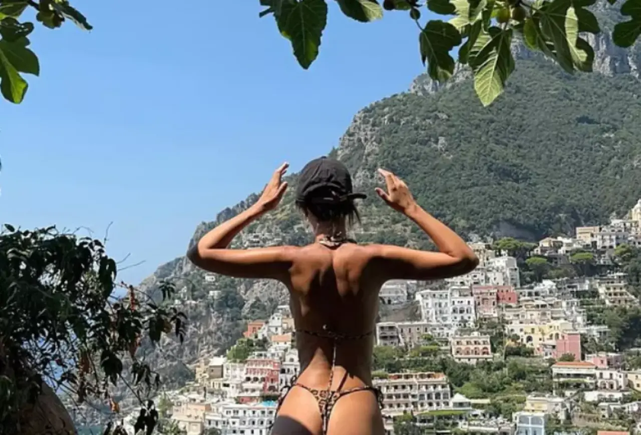 34 yaşındaki model, paylaşımlarında, neredeyse yok denecek kadar az bir bikini üstü ve iddialı kesimli altıyla Positano’nun ünlü renkli evlerinin manzarasına karşı poz verdi.