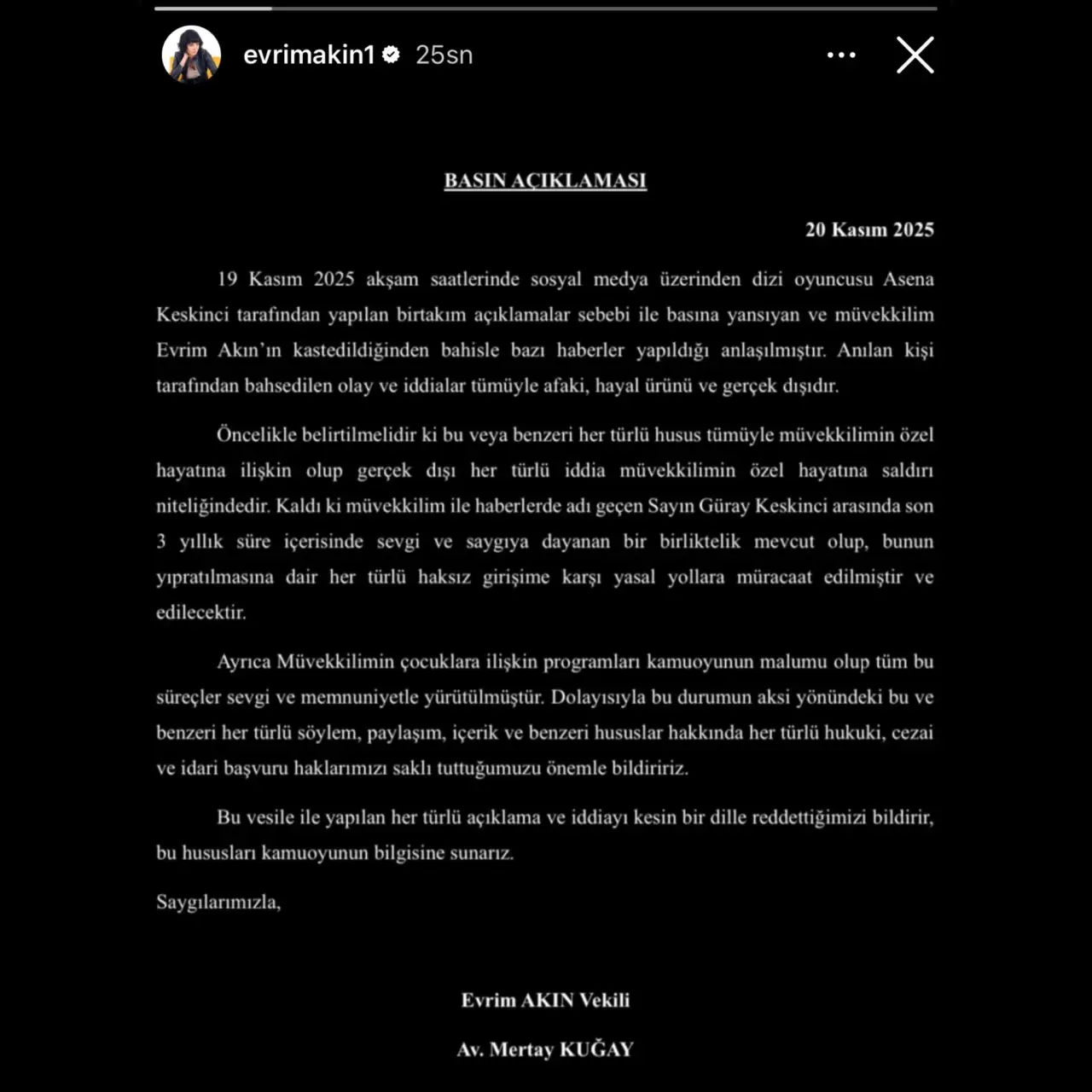 Oyuncu Asena Keskinci’nin sosyal medyada yaptığı açıklamalar sonrası gözler Evrim Akın’a çevrildi. Ünlü oyuncu, avukatı aracılığıyla yaptığı açıklamada iddiaları reddetti ve hukuki süreç başlatacaklarını duyurdu.