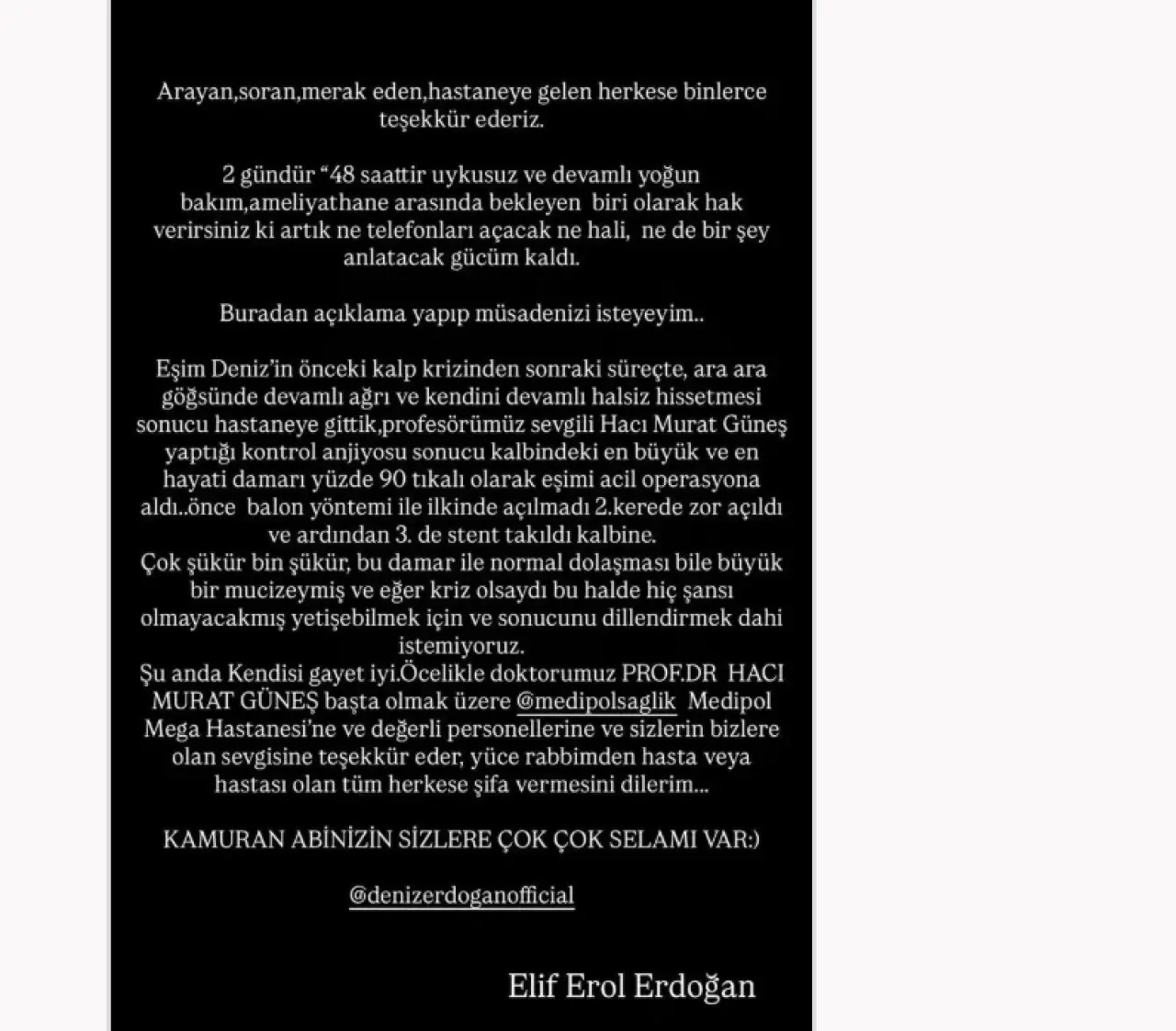 Ünlü oyuncunun eşi Elif Erol Erdoğan, yaşanan süreci sosyal medya hesabından duyurdu. Yoğun bakım ve ameliyathane arasında geçen iki günlük zorlu süreci şöyle aktardı: