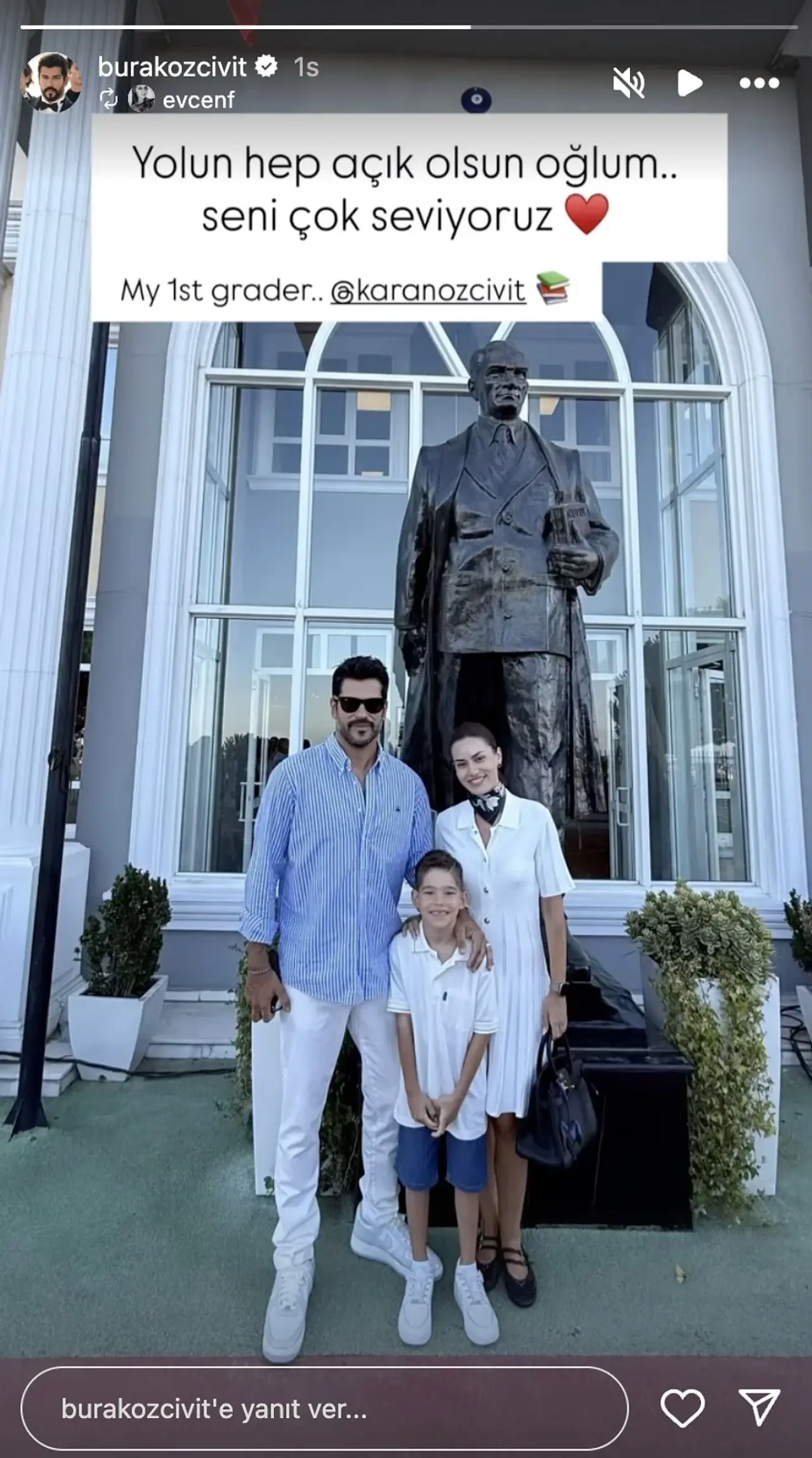 Önceki gün oğulları Karan'ı ilkokula kaydettiren Fahriye Evcen ile Burak Özçivit o anları Mustafa Kemal Atatürk büstünün önünde ölümsüzleştirdi.