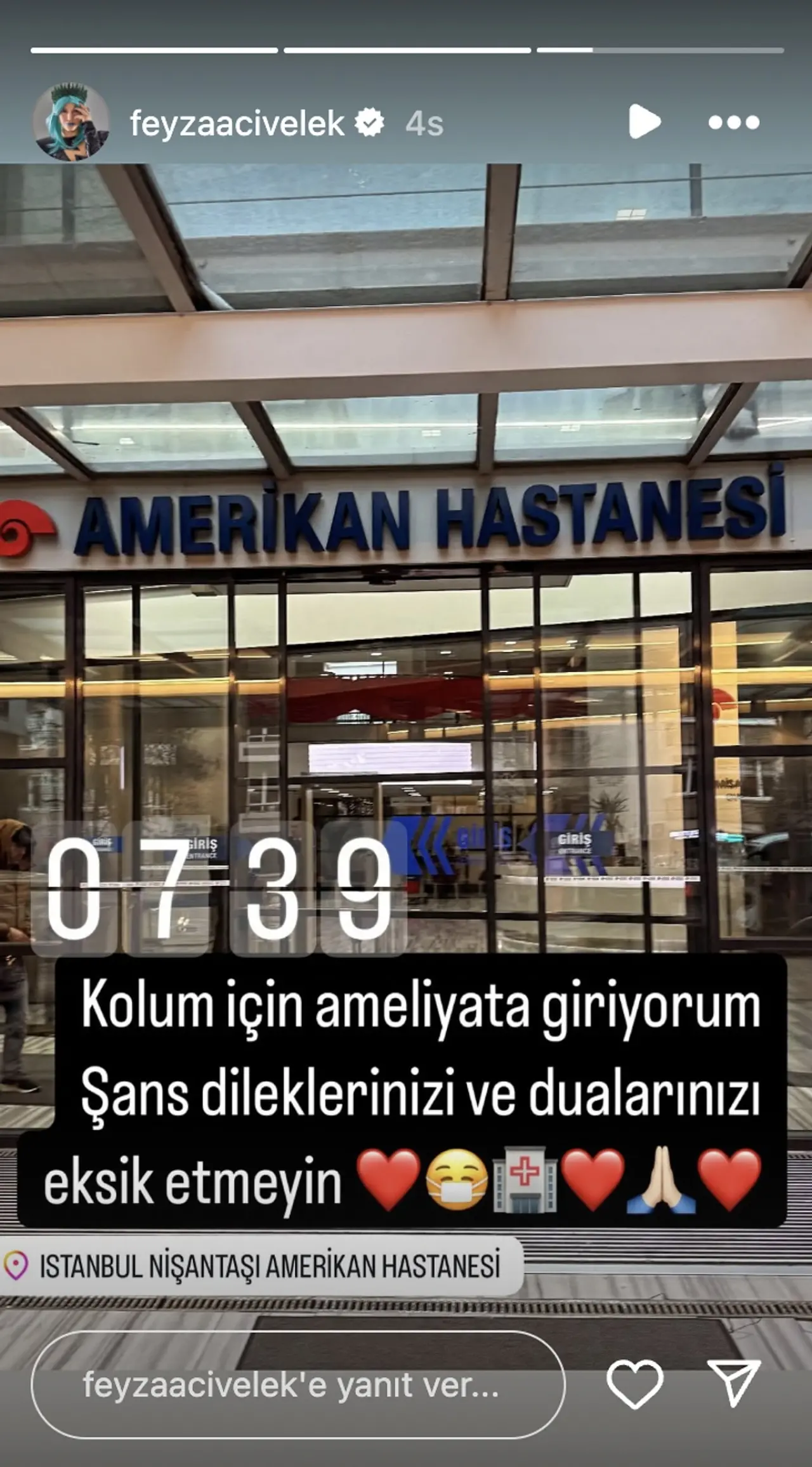 Ayrıca dizinin bir bölümünde de kolu atelli şekilde izleyicilerin karşısına çıkmıştı. Ameliyata girmeden önce hastane önünde sabah saatlerinde paylaşım yapan Feyza Civelek 'Kolum için ameliyata giriyorum. Şans dileklerinizi ve dualarınızı eksik etmeyin' diyerek tüm sevenlerinden dua istedi.