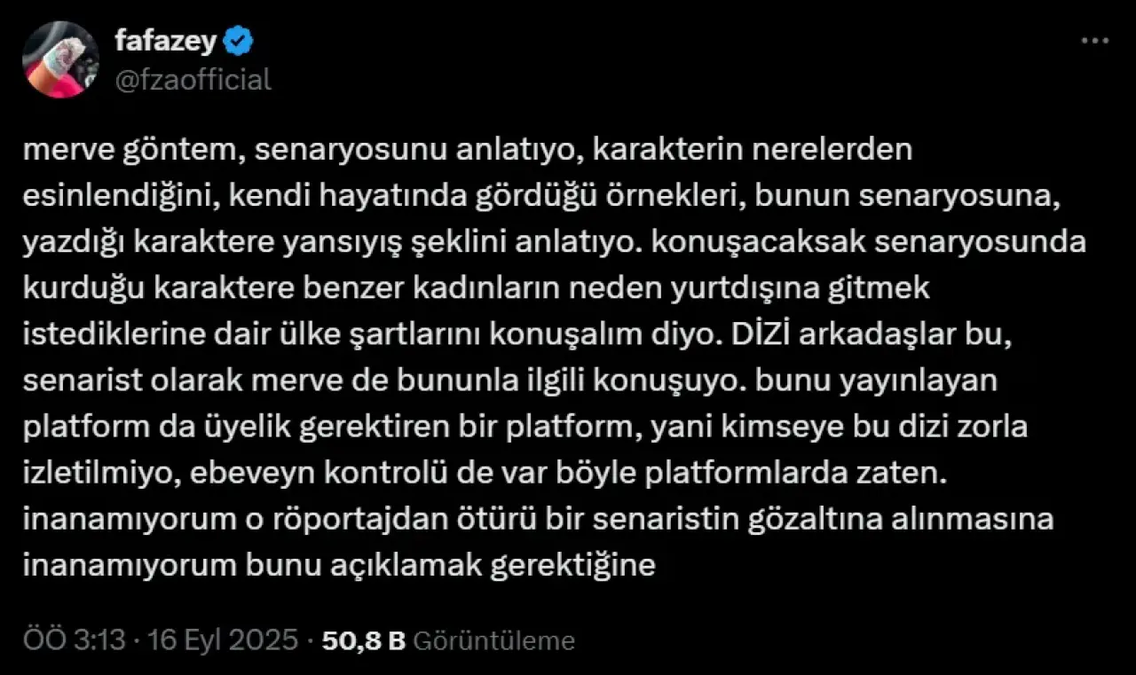 Göntem’in avukatı: “Sözleri kurgusal karakter üzerinden” Senaristin avukatı yaptığı açıklamada, söz konusu ifadelerin kurgu bir karakter üzerinden dile getirildiğini belirtmişti.