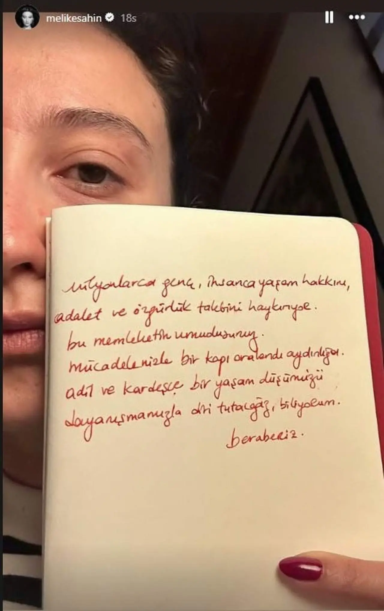 O Ses Türkiye’de jüri koltuğunda oturan ünlü şarkıcı Melike Şahin de sosyal medya hesabından yaptığı paylaşımla Saraçhane’de toplanan milyonlarca genci desteklediği bir mesaj paylaştı.