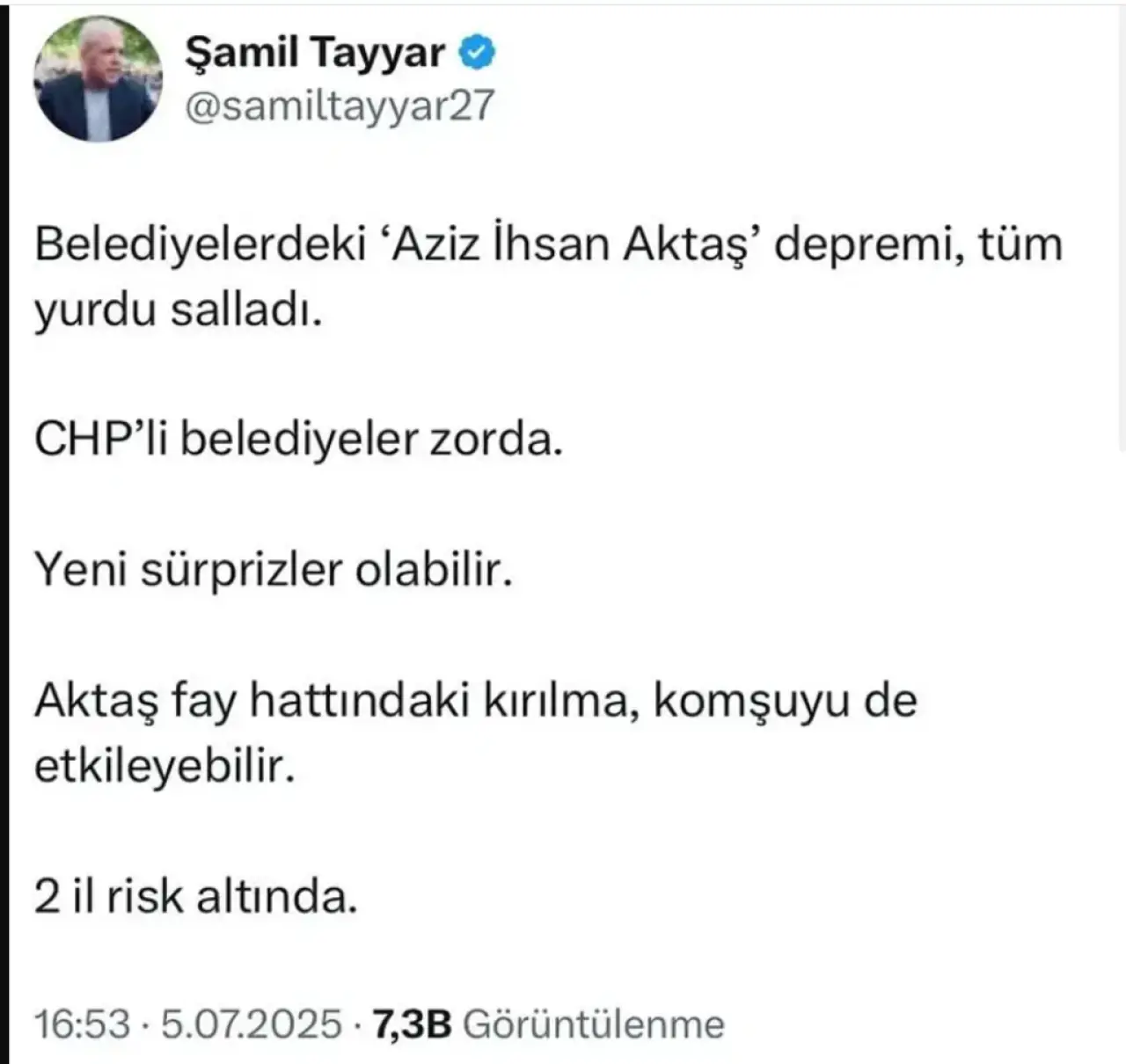 Tayyar, iki ile daha operasyon sinyali verirken “Aktay fay hattındaki kırılma, komşuyu da etkileyebilir” ifadelerini kullandı. Şamil Tayyar gelen tepkiler üzerine paylaşımını sildi.