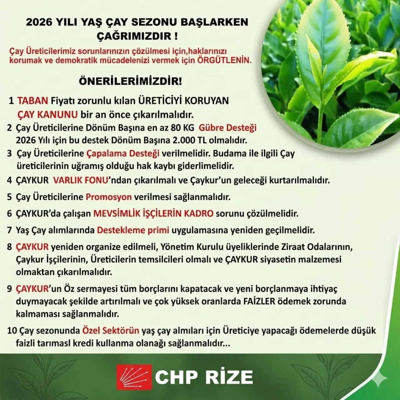 CHP Rize İl Başkanlığı, çay sektöründeki sorunların çözümü için hazırladığı önerileri de kamuoyuna duyurdu. Açıklamada, bu maddelerin aynı zamanda CHP’nin iktidara gelmesi halinde hayata geçireceği düzenlemeler olduğu vurgulandı.