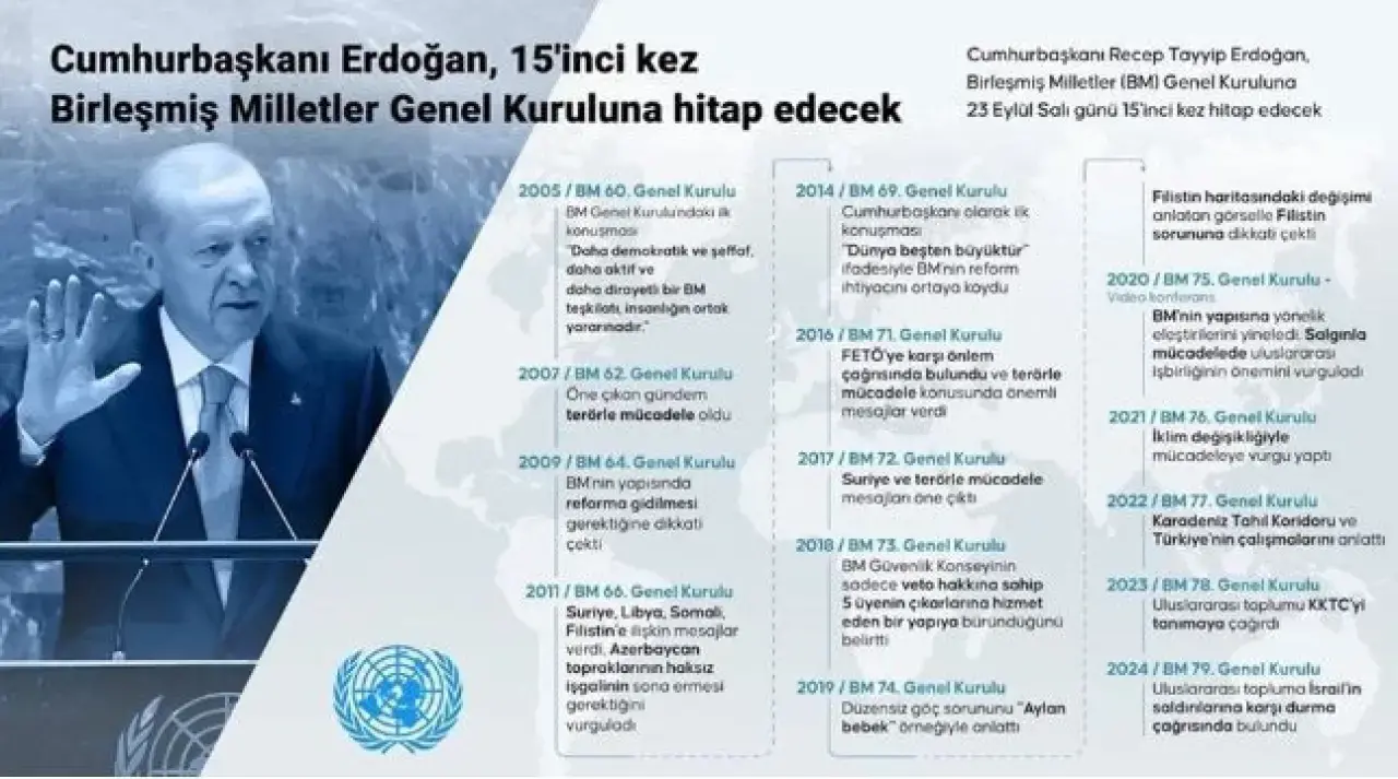 İnsanlığın vicdanını yansıtan, sorunları çözen, sorunların çözümüne katkı veren duruşumuzu Genel Kurul vesilesiyle bir kez daha vurgulayacağım. Bu bağlamda görüşmelerin ilk gününde, 23 Eylül Salı günü Birleşmiş Milletler Genel Kurulu’na hitap edeceğim. Konuşmamda Gazze’deki insani felaket ve mezalimi özellikle gündeme getireceğim. Ayrıca Türkiye’nin bölgesinde istikrarı sağlamaya dönük gayretlerinin yanı sıra uluslararası barışın korunmasına yaptığı katkılara değineceğim. Kuzey Kıbrıs Türk Cumhuriyeti’ndeki kardeşlerimizin hak ve hukuku yine gündemimizde olacak.