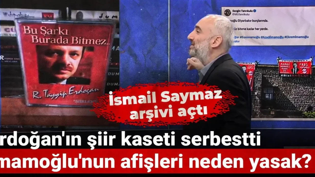 Sayın cumhurbaşkanı tutuklanmadı bile” ifadelerini kullandı.Saymaz, Erdoğan’ın şiir kaseti çıkarttığını ve bir kez bile yasaklanmadığını hatırlattı. İmamoğlu afişlerinin yasaklamasına dikkat çeken Saymaz, şunları ifade etti:“Bu Recep Tayyip Erdoğan'ın hayatında çıkardığı ilk ve tek şiir kaseti. 'Bu Şarkı Burada Bitmez' isimli kasetti. Çok etkileyici bir albümdür.