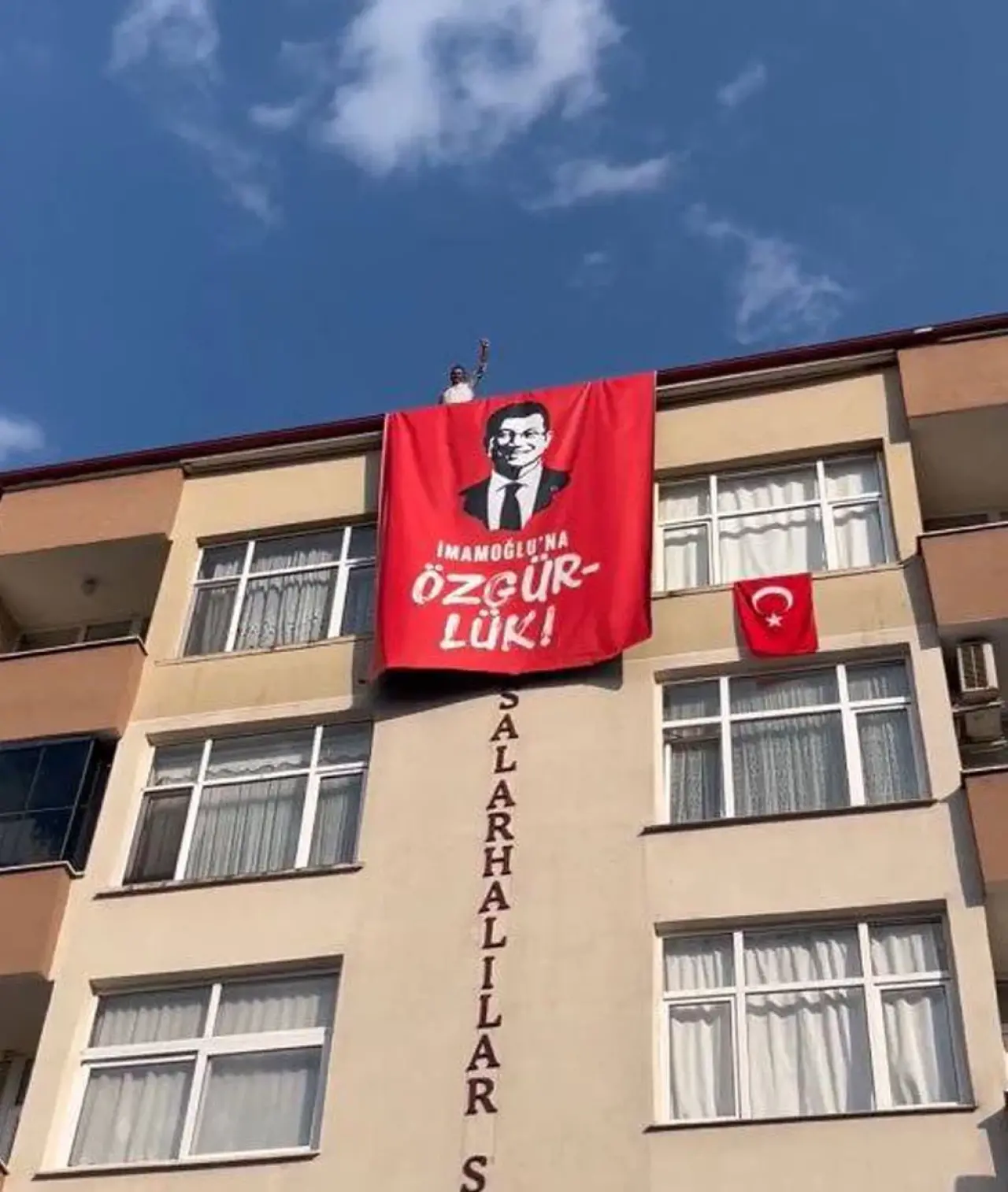 Benzer bir görüntü bu kez Rize'den geldi. CHP Rize il Başkanı Saltuk Deniz, X sosyal medya hesabı üzerinden videolu bir paylaşım yaptı. Saltuk'un paylaşımında İstanbul Büyükşehir Belediye Başkanı Ekrem İmamoğlu'nun afişinin bir binanın tepesinden sarkıtıldığı anlar yer aldı.