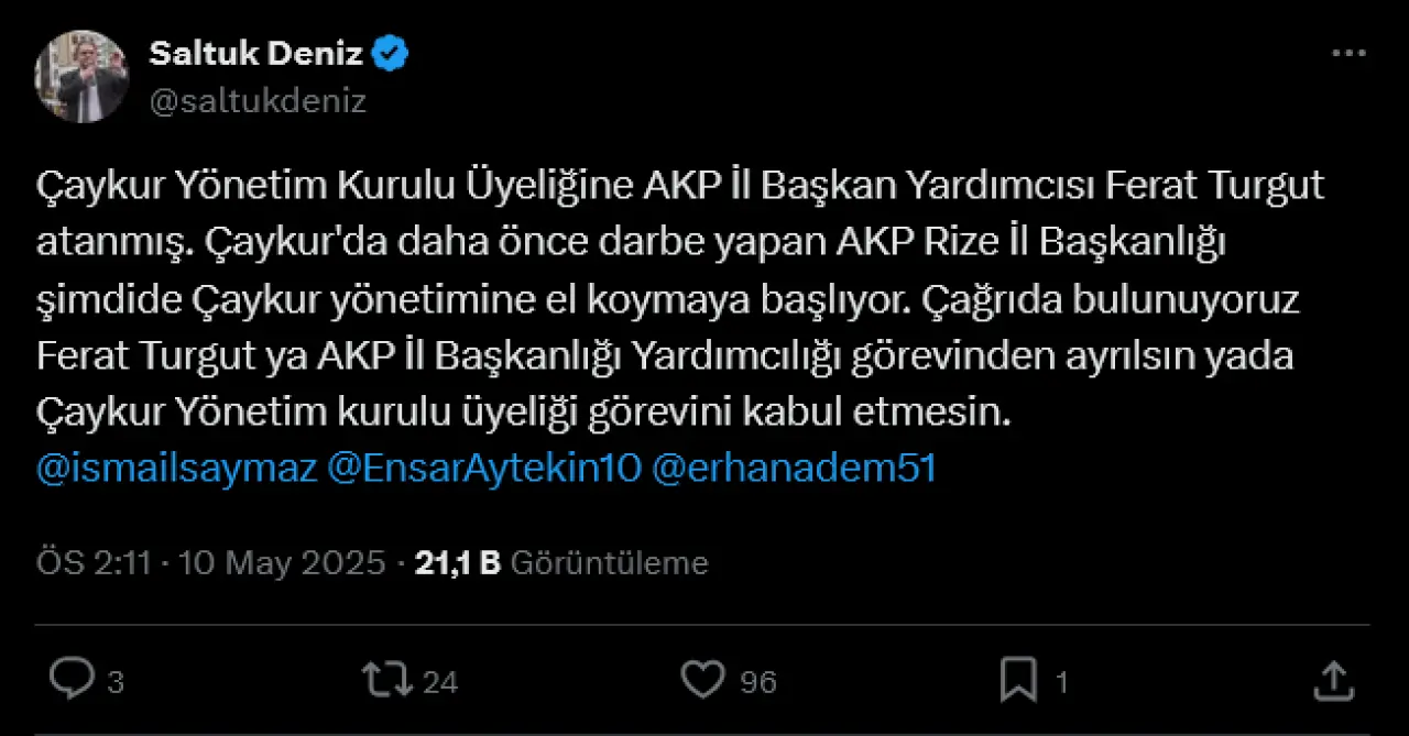 "Çaykur Yönetim Kurulu Üyeliğine AKP İl Başkan Yardımcısı Ferat Turgut atanmış. Çaykur'da daha önce darbe yapan AKP Rize İl Başkanlığı şimdide Çaykur yönetimine el koymaya başlıyor. Çağrıda bulunuyoruz Ferat Turgut ya AKP İl Başkanlığı Yardımcılığı görevinden ayrılsın yada Çaykur Yönetim kurulu üyeliği görevini kabul etmesin."