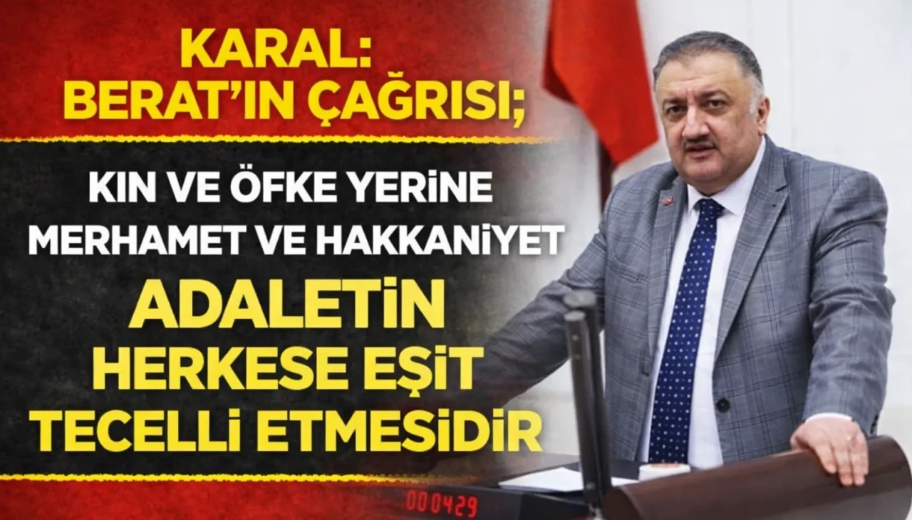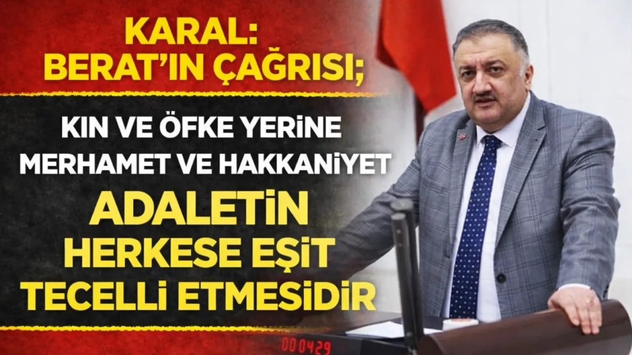 Kin, öfke ve ayrışmanın yerine merhametin, hakkaniyetin ve dayanışmanın ikame edilmesi gerektiğine dikkat çeken Karal, Berat Kandili’nin, adalet duygusunun diri tutulması gerektiğini bir kez daha hatırlattığını ifade ederek, “Affın ve mağfiretin yegane sahibi Allah’tır; ancak adalet, insan eliyle tesis edilir ve korunur. Bu mübarek gecenin, ülkemizde adaletin güçlendiği, hukukun herkese eşit uygulandığı, hiçbir vatandaşımızın kendini dışlanmış hissetmediği bir geleceğe vesile olmasını temenni ediyorum.” diye konuştu.