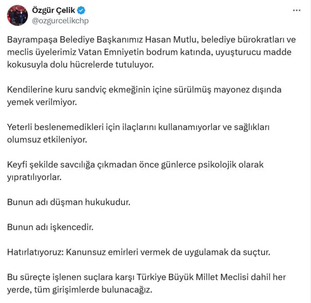 Mahkeme kararıyla CHP İstanbul İl Başkanlığı görevinden alınan Özgür Çelik, dün sabahki operasyonla gözaltına alınan Bayrampaşa Belediye Başkanı Hasan Mutlu, belediye bürokratları ve belediye meclis üyelerinin koşullarına ilişkin iddialarını paylaştı. Çelik, “Bunun adı düşman hukukudur, bunun adı işkencedir” diyerek tepki gösterdi.