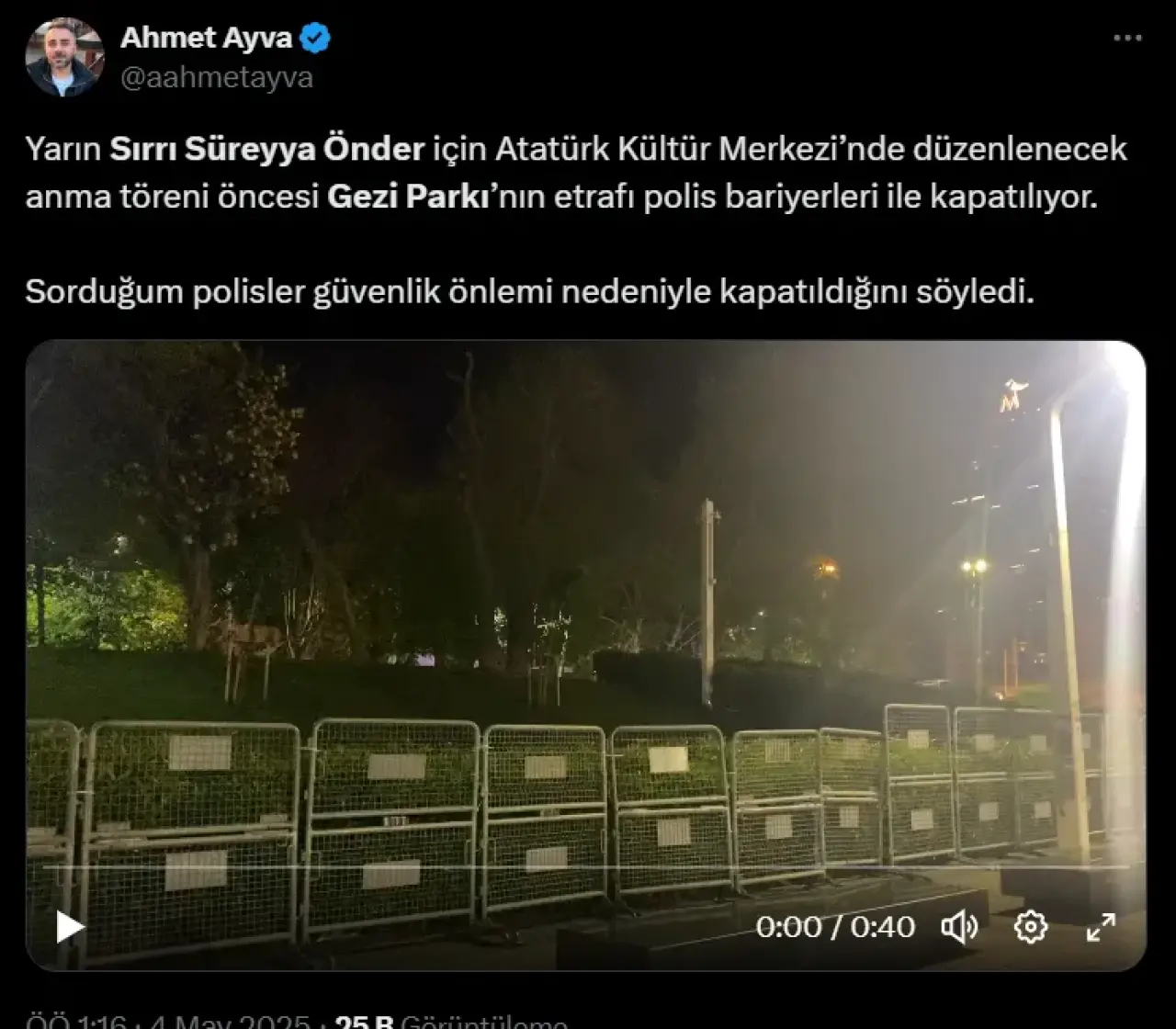 Gazeteci Ahmet Ayva’nın paylaştığı videoda ekiplerin Gezi Parkını bariyerler ile kapattığı görüldü.