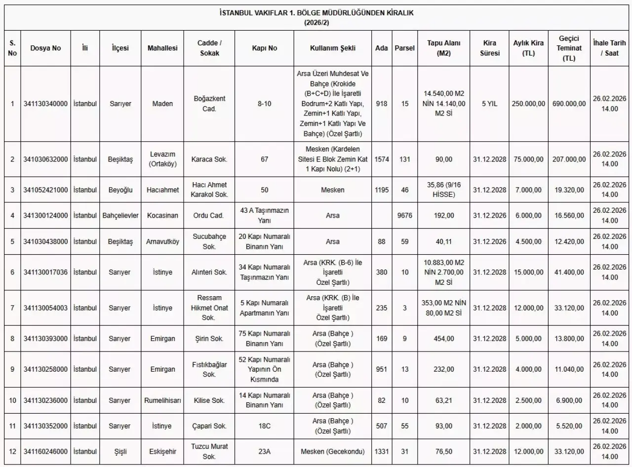 1. İşbu şartname eki listede bilgileri ve özellikleri belirtilen 12 adet kiralık vakıf taşınmaz, karşılarında yazılı Aylık/Yıllık muhammen kira bedelleri üzerinden, belirlenen kira süresi ile sınırlı olmak kaydı ile "Vakıf Taşınmazları Kira Genel Şartnamesi" hükümleri çerçevesinde (https://cdn.vgm.gov.tr/mevzuat/vakif-tasinmazlarin-kiralama-usul-ve-esaslari-yeni.pdf) ve kira tip sözleşmesi (https://cdn.vgm.gov.tr/mevzuat/vakif tasinmazlarin kiraya verilme tip sozlesmesi ve genel sartnamesi.pdf) kapsamında ihaleyle kiraya verilecektir. Kira İhalesi; 26.02.2026 Perşembe günü Saat: 14:00'de, Gümüşsuyu Mahallesi İnönü Cd. No:2, Beyoğlu/İstanbul adresindeki İstanbul Vakıflar 1. Bölge Müdürlüğü Hizmet Binasının Zemin Kat İhale Salonunda yapılacaktır. İhale 2886 sayılı Kanunun 45. Maddesine göre açık teklif usulü ile yapılacak olup, İdaremiz İhaleyi yapıp yapmamakta, listenin istediği sırasından ihaleyi başlatmaya, devam ettirmeye ve en uygun bedeli belirlemekte serbesttir. İhale Listesinin 1. sırasında yer alan taşınmaz 5 yıl süreyle özel şartlı olarak, 4. ve 5. sırasında yer alan taşınmazlar ise 31.12.2026 tarihine kadar ihale edilecektir. Bunların dışında kalan 9 adet vakıf taşınmaz 31.12.2028 tarihine kadar ihaleyle kiralanacaktır. Kira sözleşmesi onay tarihinden itibaren kiralar aylık olarak peşin ödenir. İdarenin uygun görmesi halinde ihalede ortaya çıkacak aylık kira bedeline sözleşme bitim tarihinden itibaren müteakip yıllar için, Türkiye İstatistik Kurumu’nca belirlenen Tüketici Fiyat Endekslerindeki 12 aylık ortalamalara göre değişimden az olmamak suretiyle kira artışı yapılacaktır. Ancak kira bedelinin emsal ve rayiçlerinin altında kaldığının tespiti durumunda, yeni kira bedeli emsal ve rayiç bedel baz alınarak güncellenir. İdarenin belirlediği yeni kira bedelini kabul eden kiracının sözleşmesi aynı şartlarda devam eder. Kira artışını kabul etmeyenlerin kira müddeti uzamamış olup, 2886 Sayılı Devlet İhale Kanununun 75.Maddesi gereğince ilgili Mülki Amirlikçe 15 gün içerisinde tahliye edilecektir.