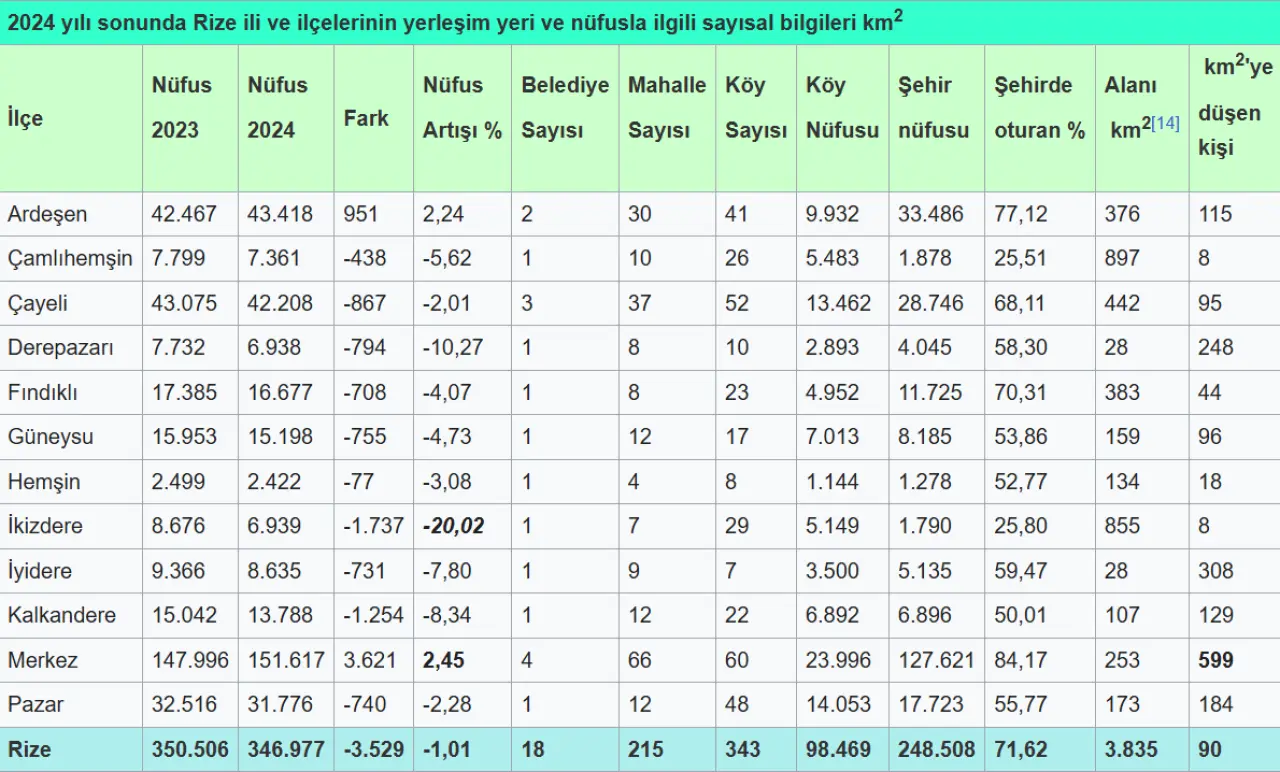 Rize il nüfus bilgileri