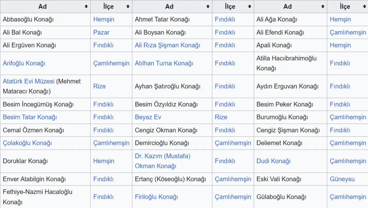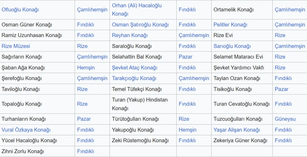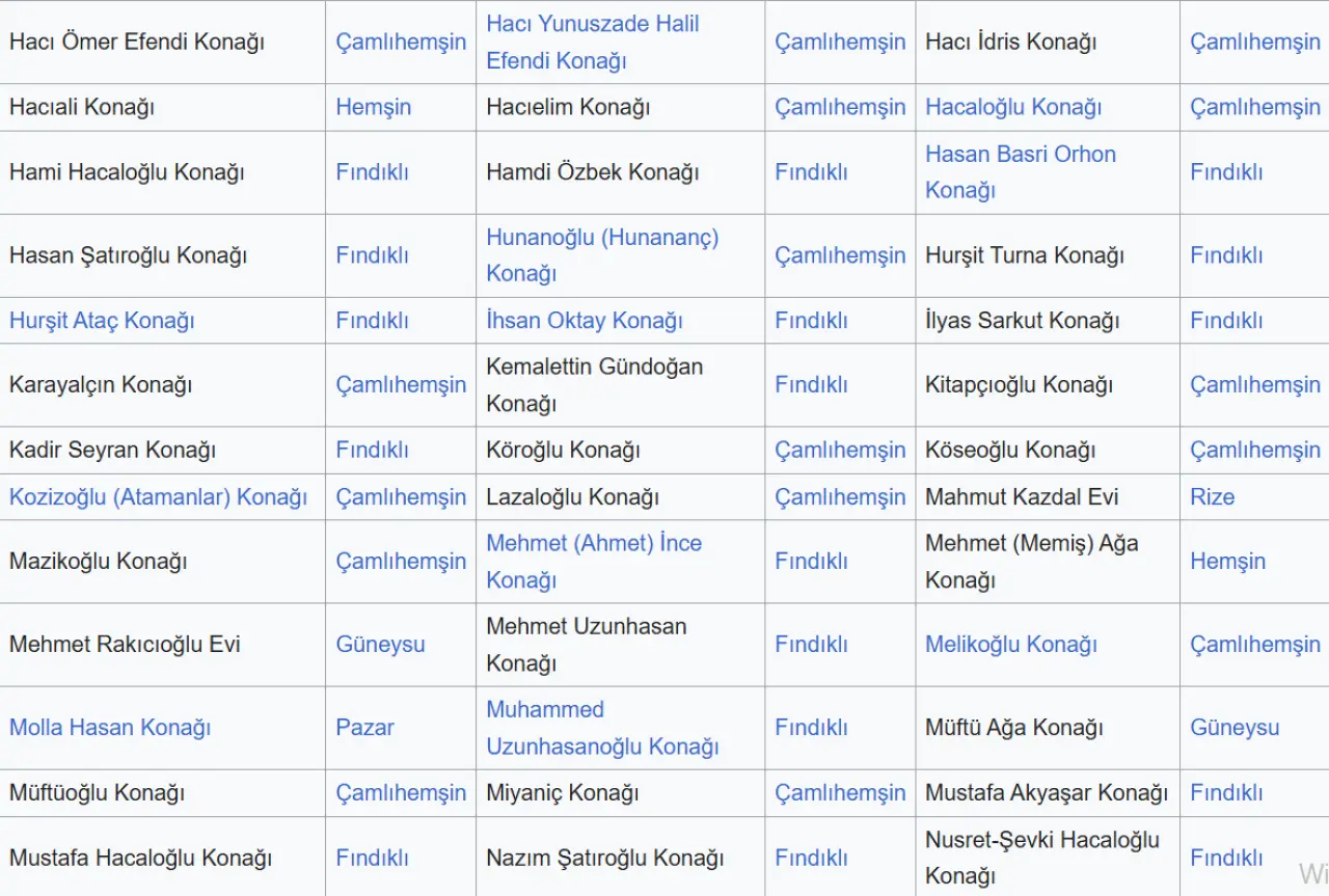 Rize'deki tarihi konakların çoğu Laz evlerindeki gibi taş ve ahşap veya Hemşin evlerindeki gibi taş malzemeden yapılmaktadır.[42] Laz konakları Fındıklı başta olmak üzere Rize'nin doğusunda, Hemşin konakları ise Çamlıhemşin başta olmak üzere Hemşinlilerin yaşadığı yerlerde görülmektedir. Günümüze ulaşan Laz konaklarının çoğu 18 ve 19. yüzyıllarda, Hemşin konakları ise 19. yüzyılın sonları ve 20. yüzyılın başlarında inşa edilmiştir.