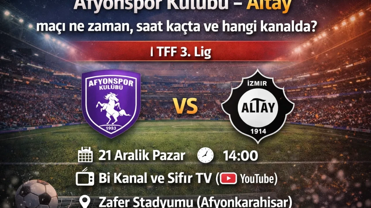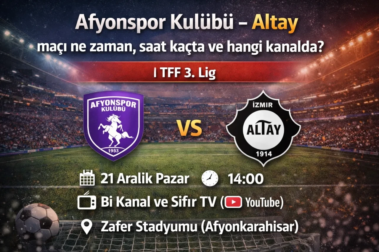 Afyonspor Kulübü – Altay maçı, TFF 3. Lig kapsamında 21 Aralık 2025 tarihinde oynanacak. Sıfır TV tarafından yayınlanacak karşılaşma saat 17:00 (TSİ) başlayacak. Peki Afyonspor Kulübü – Altay maçı ne zaman, saat kaçta ve hangi kanalda? İşte, mücadeleye ilişkin bilgiler…