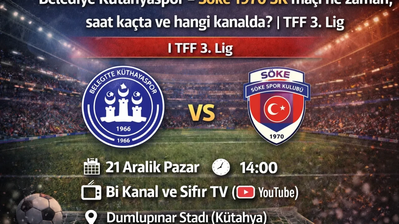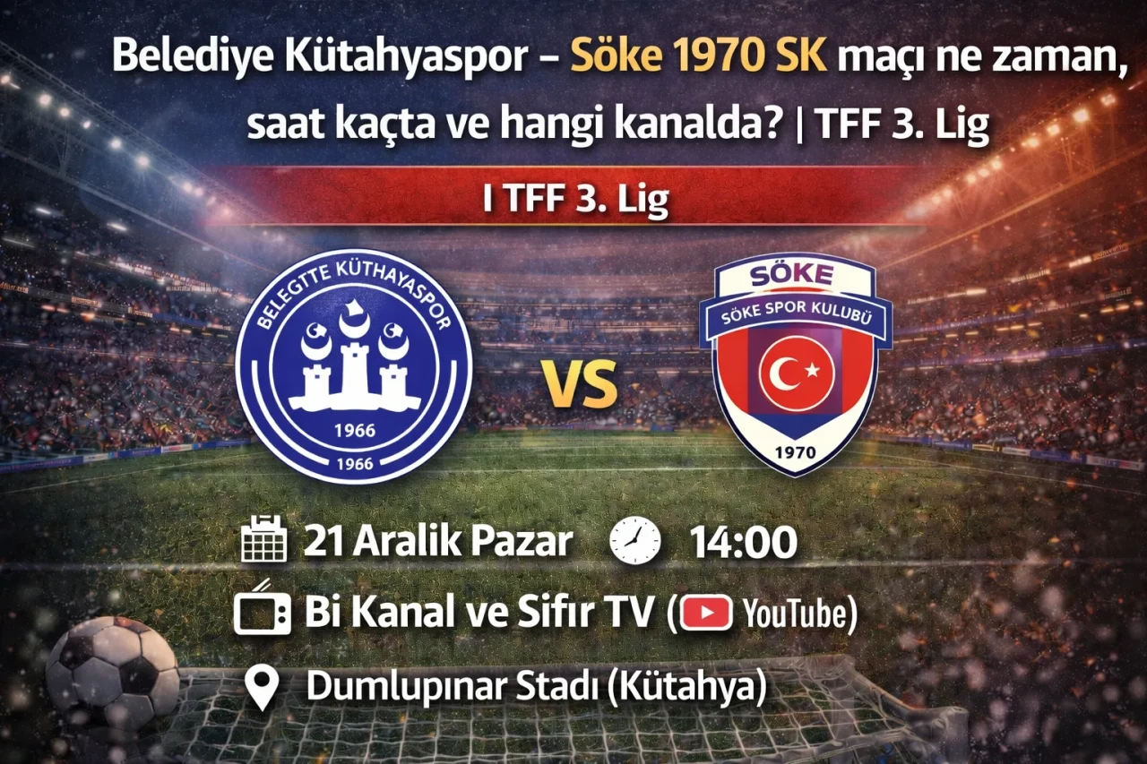 Belediye Kütahyaspor – Söke 1970 SK maçı, TFF 3. Lig kapsamında 21 Aralık 2025 tarihinde oynanacak. Bİ KANAL tarafından yayınlanacak karşılaşma saat 15:00 (TSİ) başlayacak. Peki Belediye Kütahyaspor – Söke 1970 SK maçı ne zaman, saat kaçta ve hangi kanalda? İşte, mücadeleye ilişkin bilgiler…