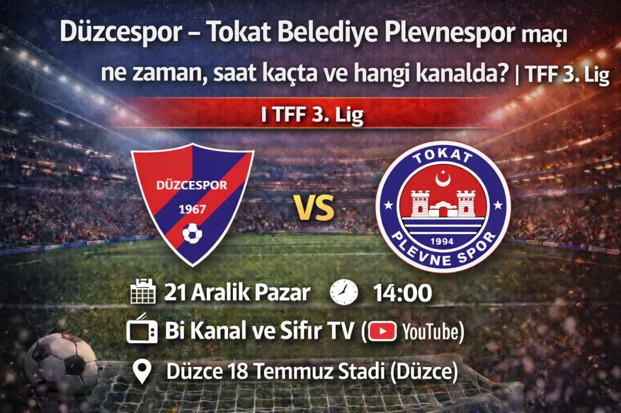 Düzcespor – Tokat Belediye Plevnespor maçı, TFF 3. Lig kapsamında 21 Aralık 2025 tarihinde oynanacak. Sıfır TV Youtube tarafından yayınlanacak karşılaşma saat 13:00 (TSİ) başlayacak. Peki Düzcespor – Tokat Belediye Plevnespor maçı ne zaman, saat kaçta ve hangi kanalda? İşte, mücadeleye ilişkin bilgiler…
