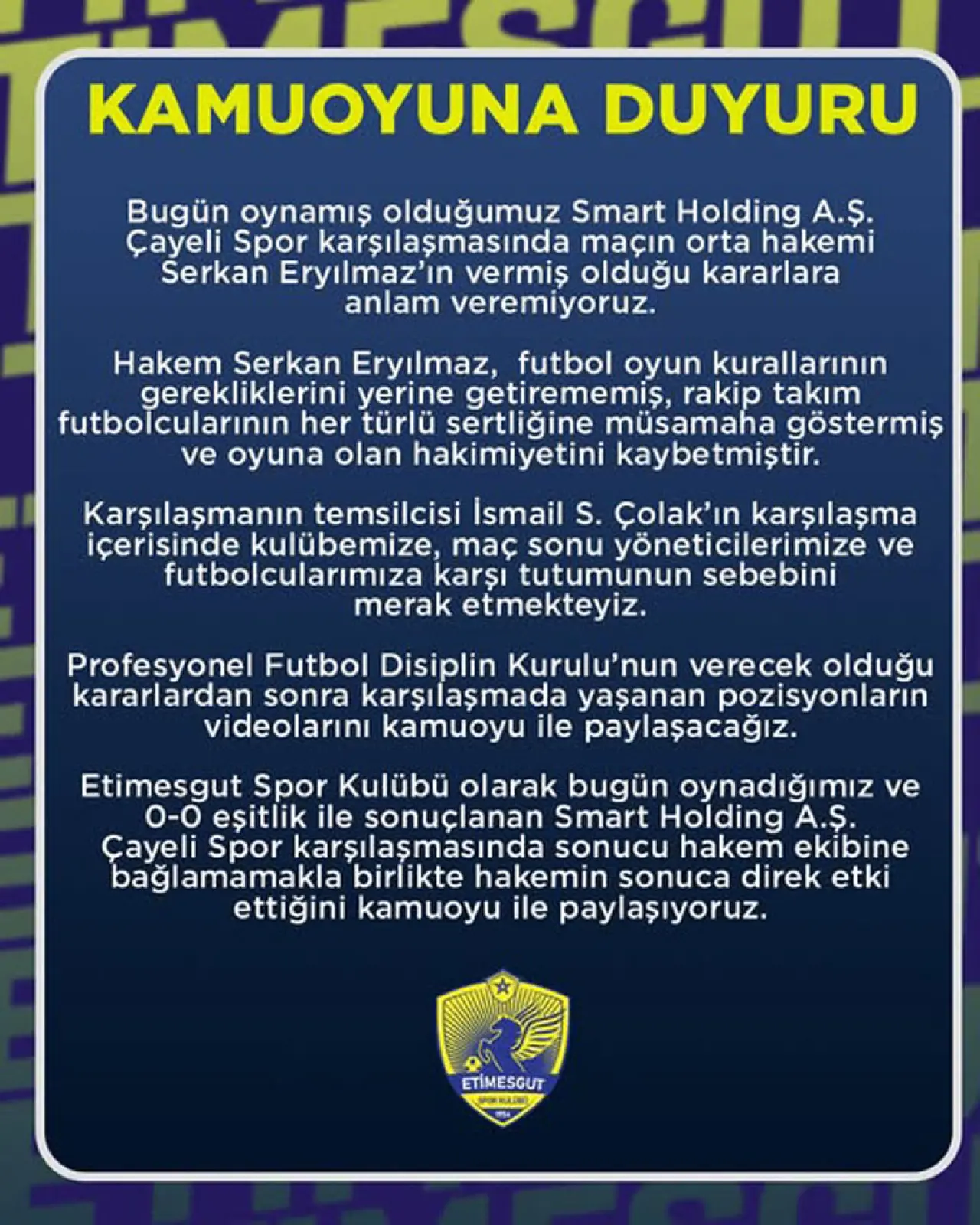 Etimesgut SK’nın açıklamasında şu ifadelere yer verildi: “Bugün oynamış olduğumuz Smart Holding A.Ş. Çayeli Spor karşılaşmasında maçın orta hakemi Serkan Eryılmaz’ın vermiş olduğu kararlara anlam veremiyoruz. Hakem Serkan Eryılmaz, futbol oyun kurallarının gerekliklerini yerine getirememiş, rakip takım futbolcularının her türlü sertliğine müsamaha göstermiş ve oyuna olan hakimiyetini kaybetmiştir.”