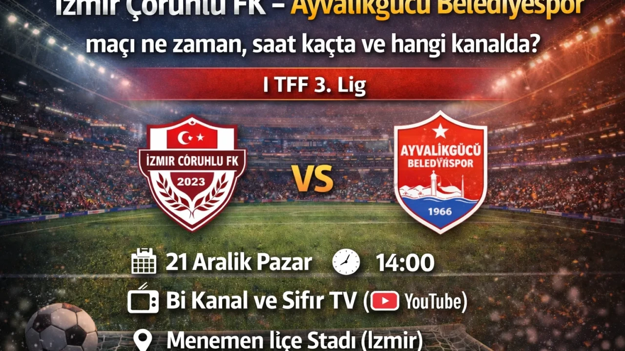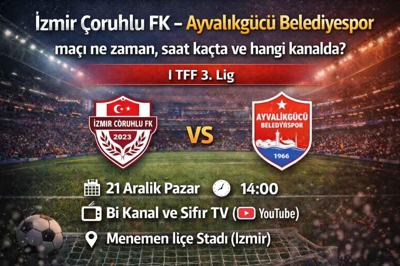 İzmir Çoruhlu FK – Ayvalıkgücü Belediyespor maçı, TFF 3. Lig kapsamında 21 Aralık 2025 tarihinde oynanacak. Sıfır TV Youtube tarafından yayınlanacak karşılaşma saat 15:00 (TSİ) başlayacak. Peki İzmir Çoruhlu FK – Ayvalıkgücü Belediyespor maçı ne zaman, saat kaçta ve hangi kanalda? İşte, mücadeleye ilişkin bilgiler…