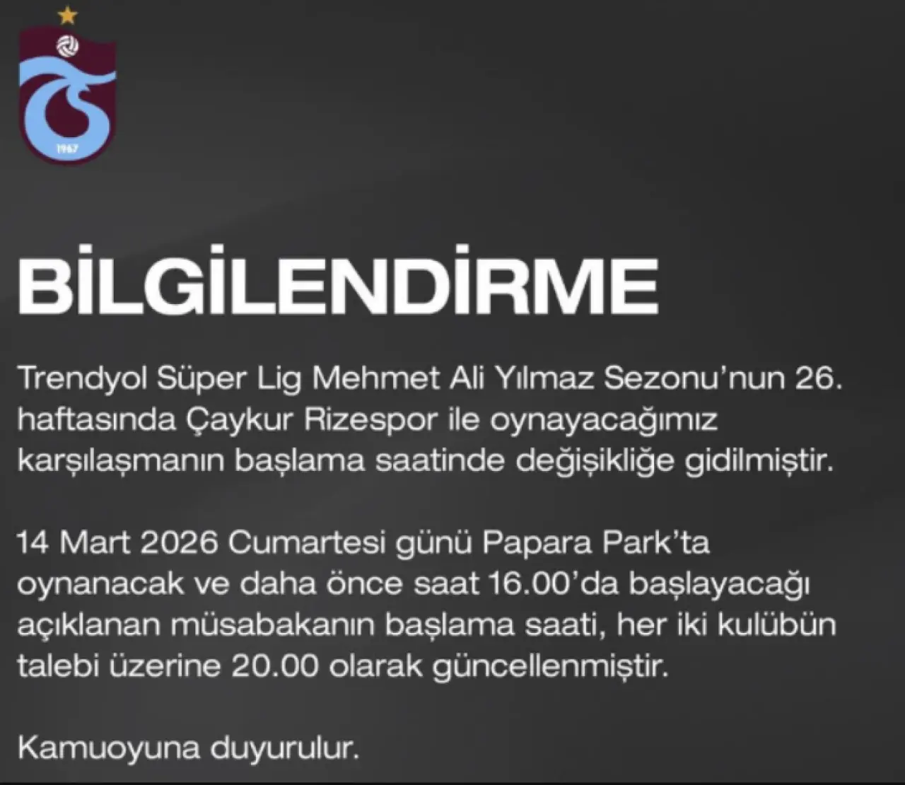 Trabzonspor Kulübü tarafından yapılan açıklamada, 14 Mart 2026 Cumartesi günü Trabzon’da Papara Park’ta oynanacak mücadelenin daha önce saat 16.00’da başlayacağının duyurulduğu hatırlatıldı.