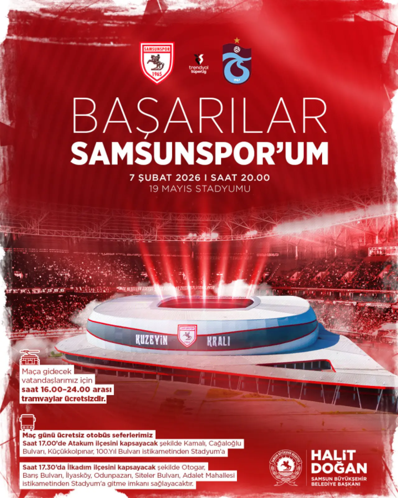 Samsun Büyükşehir Belediyesi'nden yapılan açıklamaya göre; maç günü taraftarların yoğunluğunu azaltmak ve konforlu ulaşım sağlamak amacıyla tramvay seferleri belirli saatler arasında ücretsiz olacak. 16.00 ile 24.00 saatleri arasında tüm taraftarlar tramvay hizmetinden bedelsiz olarak yararlanabilecek.