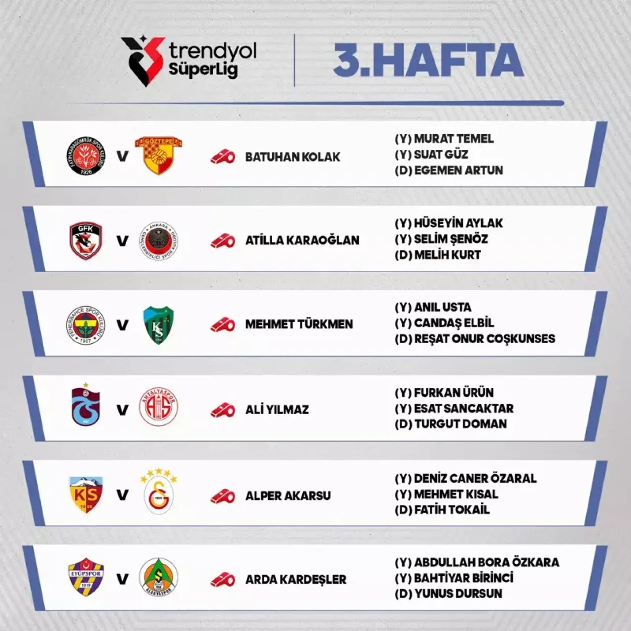 Trendyol Süper Lig'in 3. haftasında heyecan; yarın, 23 Ağustos Cumartesi, 24 Ağustos Pazar ve 25 Ağustos Pazartesi günü oynanacak maçlarla yaşanacak. Söz konusu karşılaşmalarda görev yapacak hakemler belli oldu.