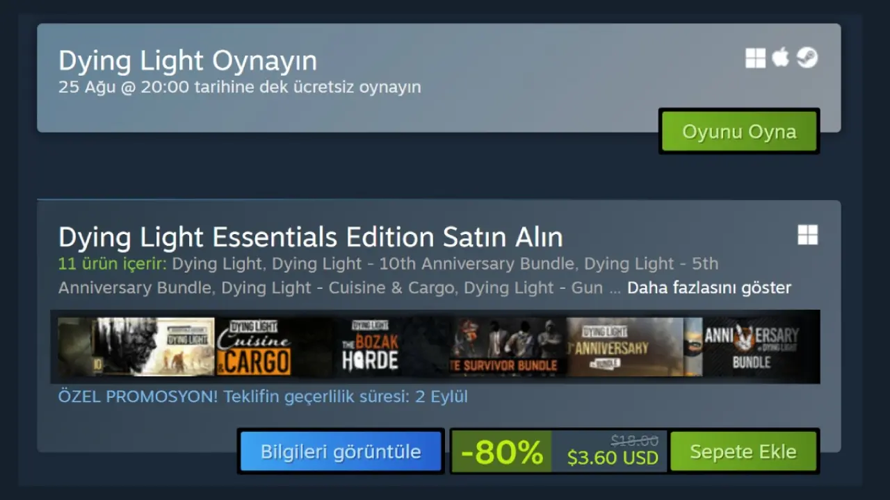 Steam platformunda ise korku ve zombi temalı hayatta kalma oyunu Dying Light, 25 Ağustos 2025 tarihine kadar ücretsiz olarak oynanabiliyor. Üç gün boyunca sınırsız erişim sunulan bu fırsat, oyunu daha önce denememiş olanlar için kaçırılmayacak bir fırsat.